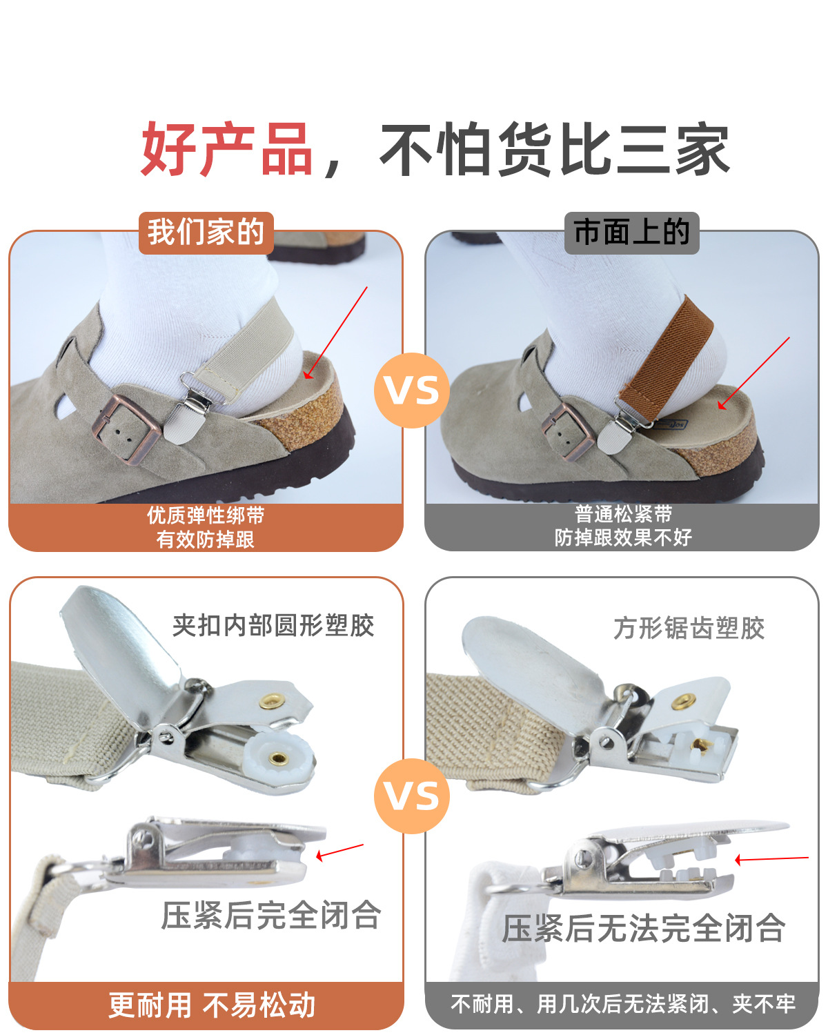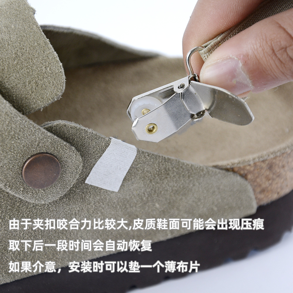 装上后尽量不要频繁拆卸,以免减短夹扣使用寿命 此产品适合薄款拖鞋,厚棉拖建议拍手缝款,具体可联系客服