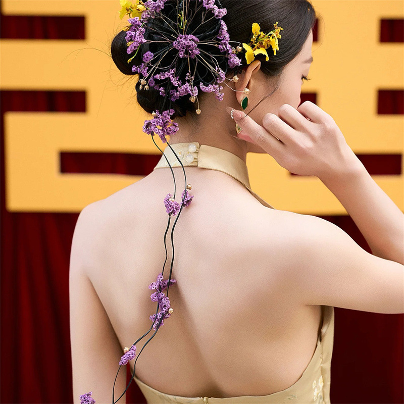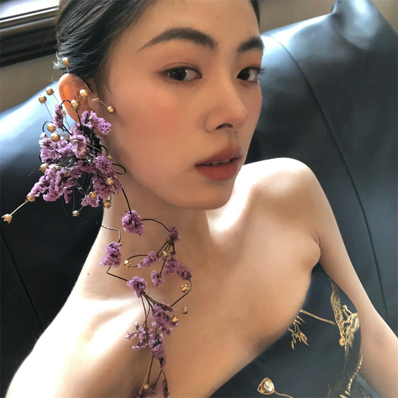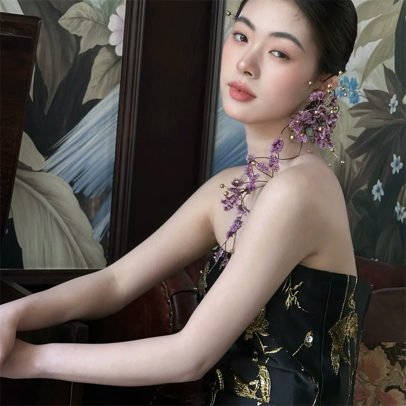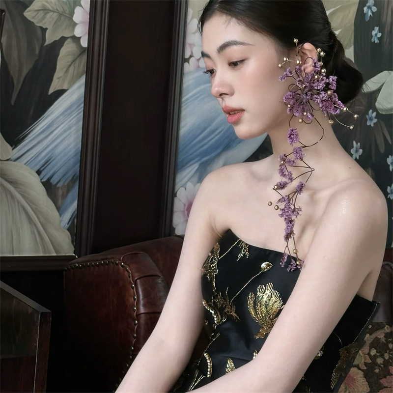 新しい中国風の帽子ドレスチャイナドレスヘアアクセサリーブライダルフォレストパープルドライフラワーイヤリングユニークなニッチイヤリング