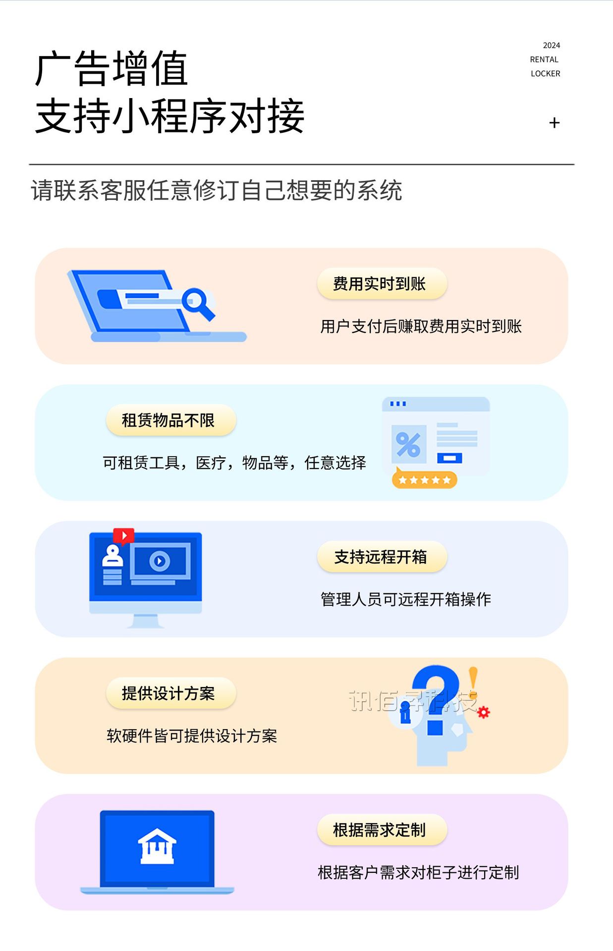 讯佰昇智能厂家长期提供智能共享租赁柜、便民工具柜、体育用品租赁柜、共享篮球柜、头盔借还柜、CCD共享柜、AI机器人租赁柜等多场景产品方案。为满足客户不同场景需求,讯佰昇智能厂家可对接内网、二次开发、支持定制、免费出图、整装发货。