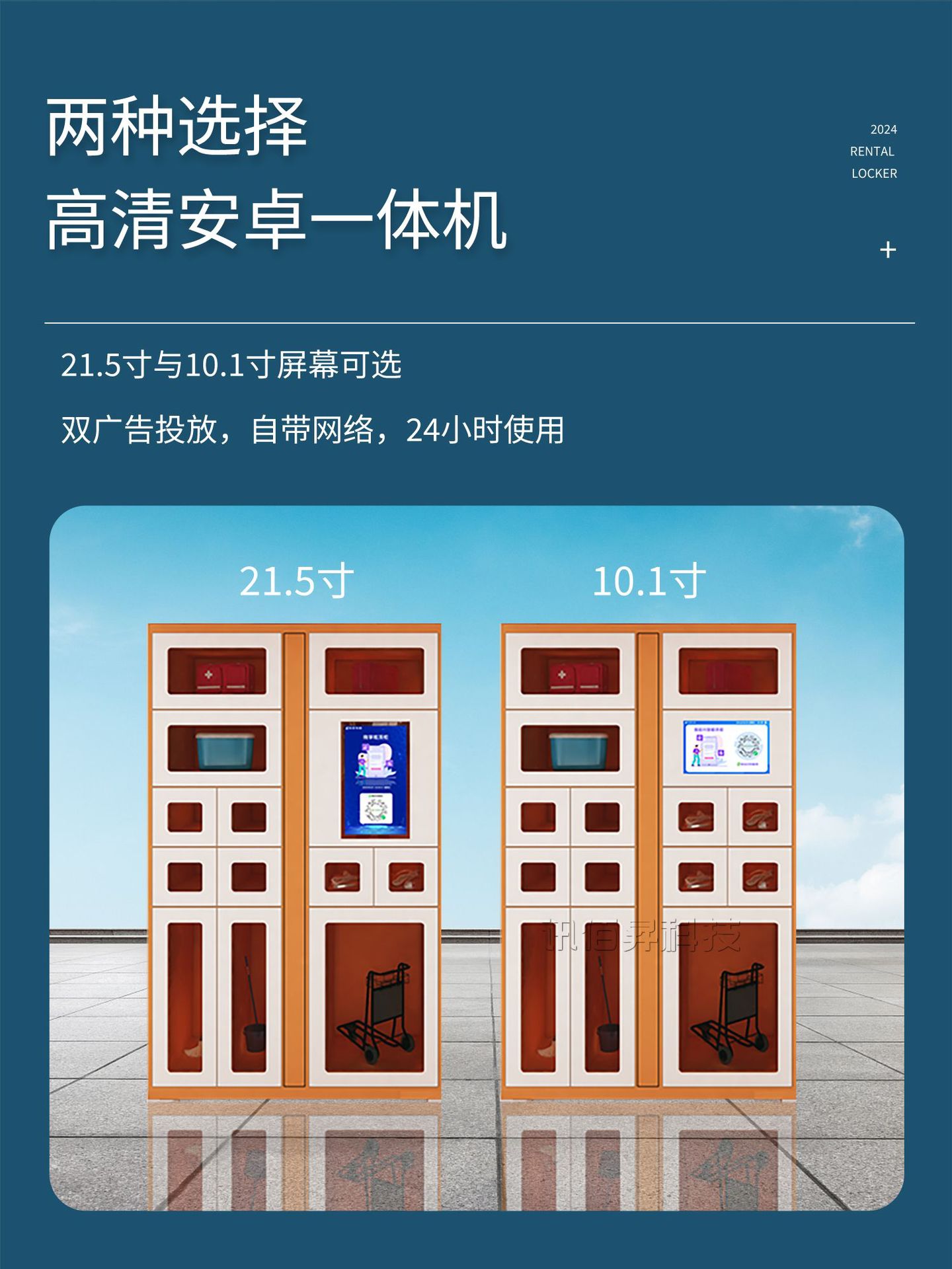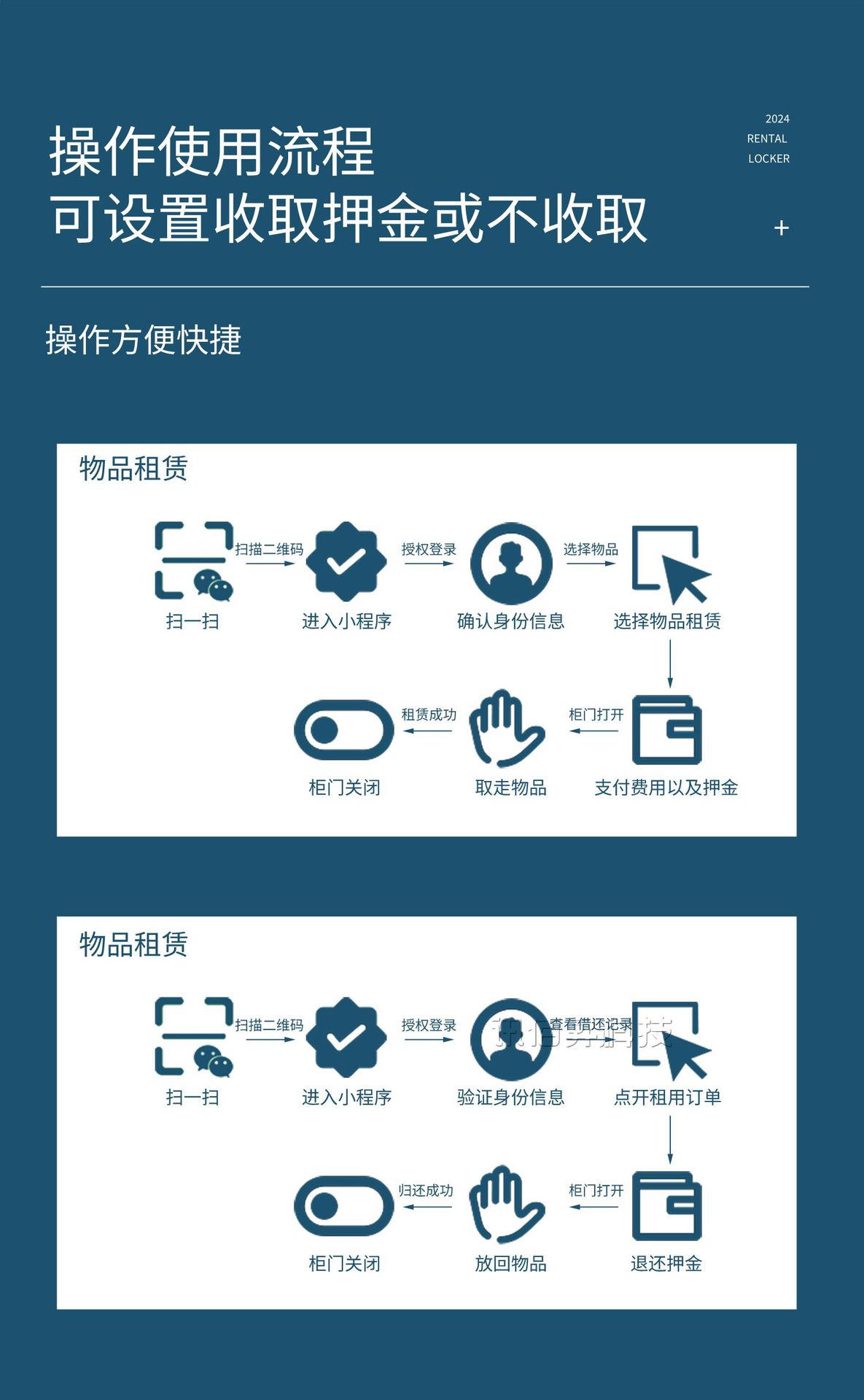 智能租赁柜先进的技术实现租赁流程的自动化管理和智能化操作,可以实现人脸识别、刷卡与扫码、自助租赁与归还、实时监控与管理、客户可以根据放入的物品设置收费标准及押金模式,管理员通过电脑或手机APP远程监控设备状态、管理库存、分析使用数据,实现精细化管理。