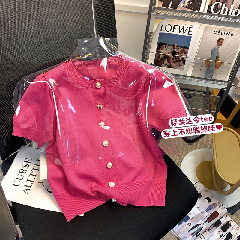 ローズピンクのパフ半袖ニットカーディガン、香りの良いトップス、超美しいニットジャケット、高級Tシャツ