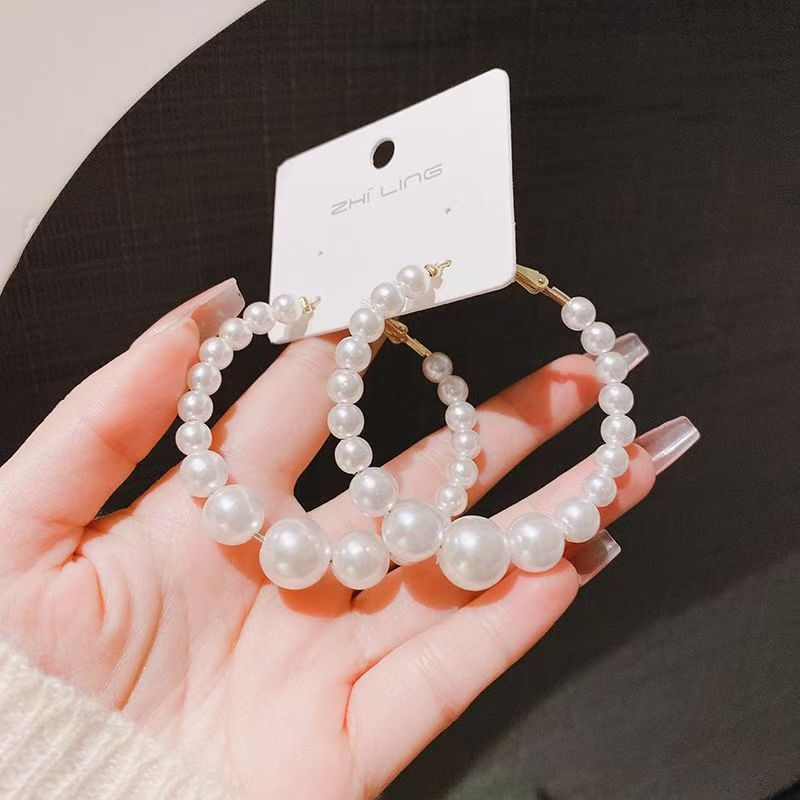 ヨーロッパとアメリカの誇張されたサイズの模造真珠サークル幾何学的なシルバー針イヤリングシンプルな気質ライト高級ハイエンドイヤリング卸売