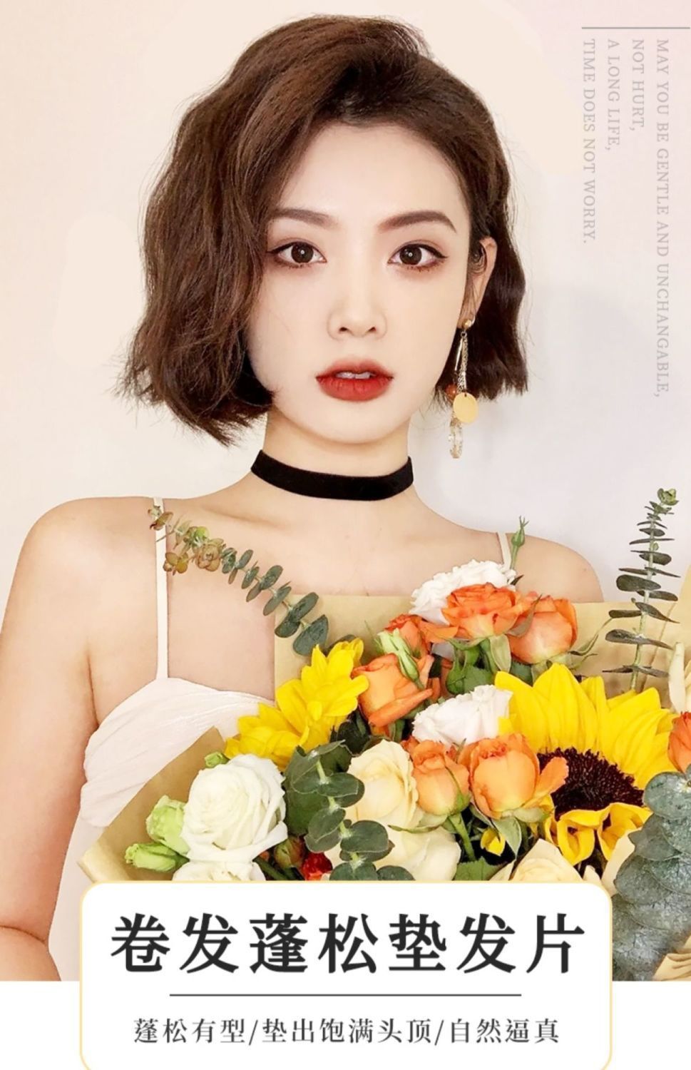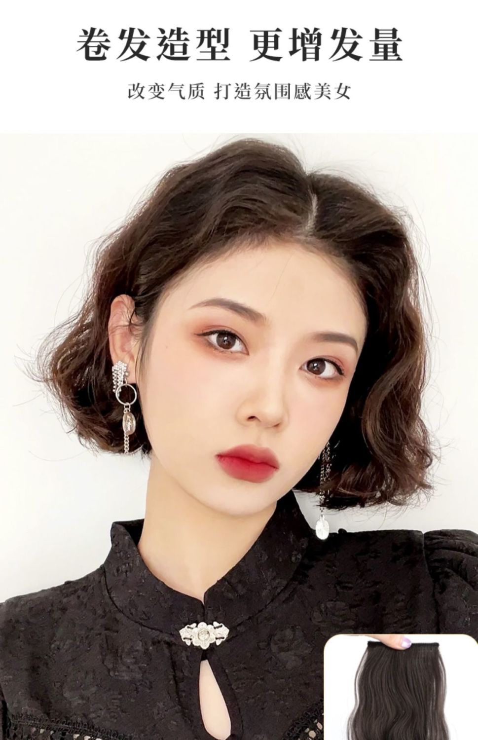 かつらの髪は盤頭のつぼみを包んで、クリップ式の9つの花巻をつかんで、団子の頭を包んで、5色の大きい髪輪を整えます。