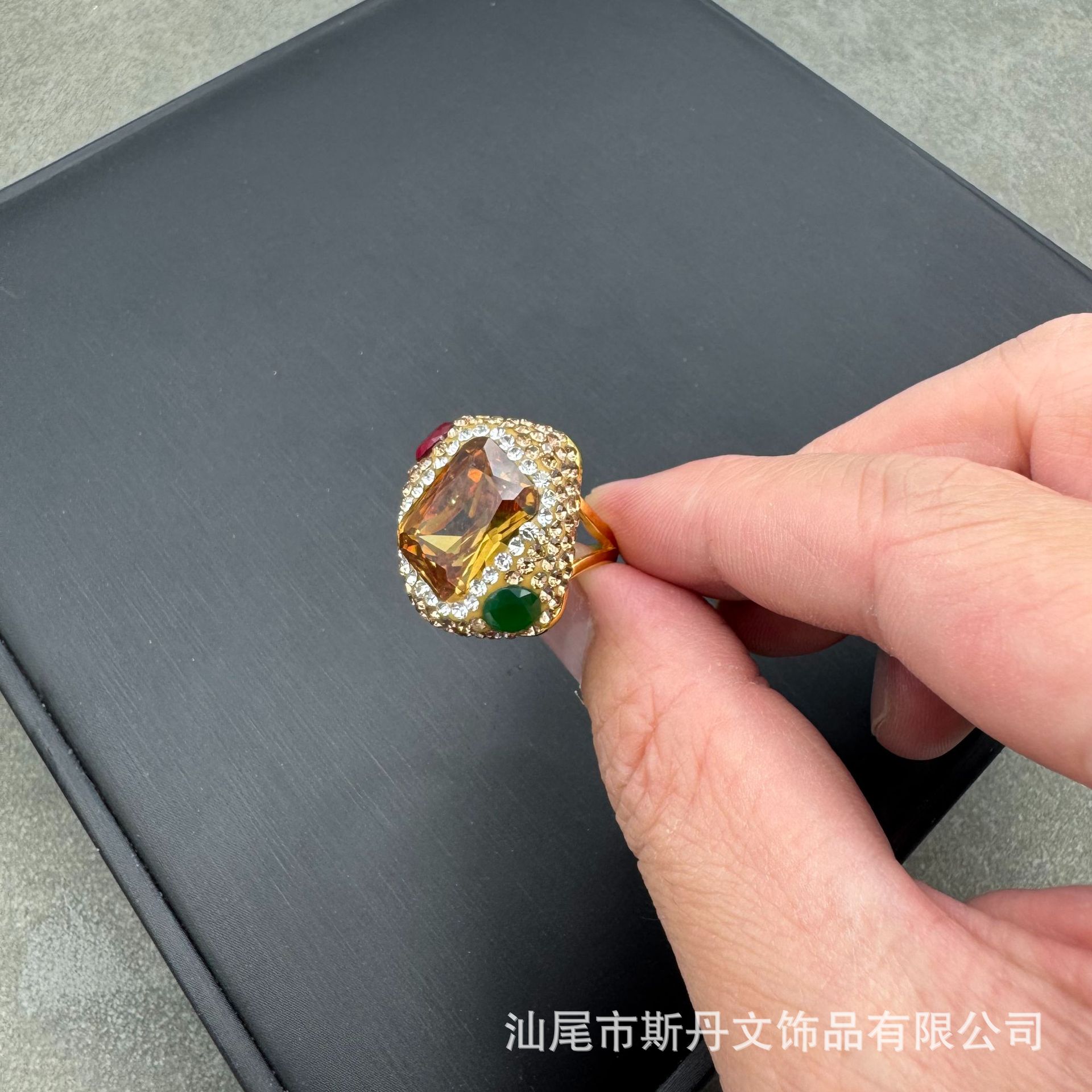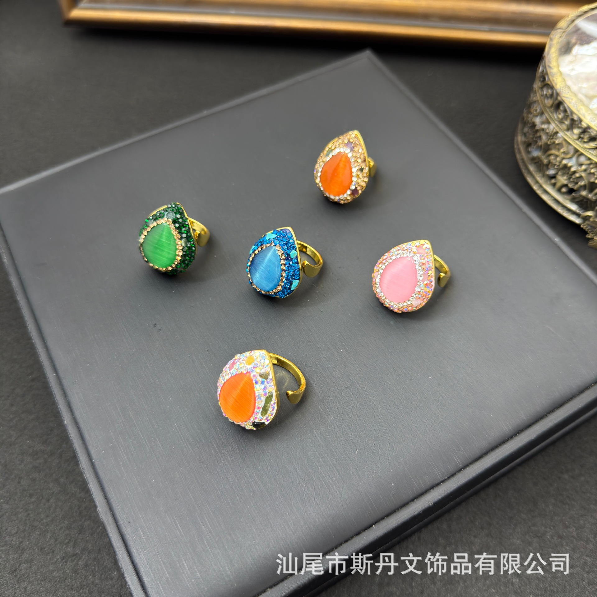 新款猫眼石镶嵌原石戒指个性中古水滴形点钻饰品高端指环保色批发