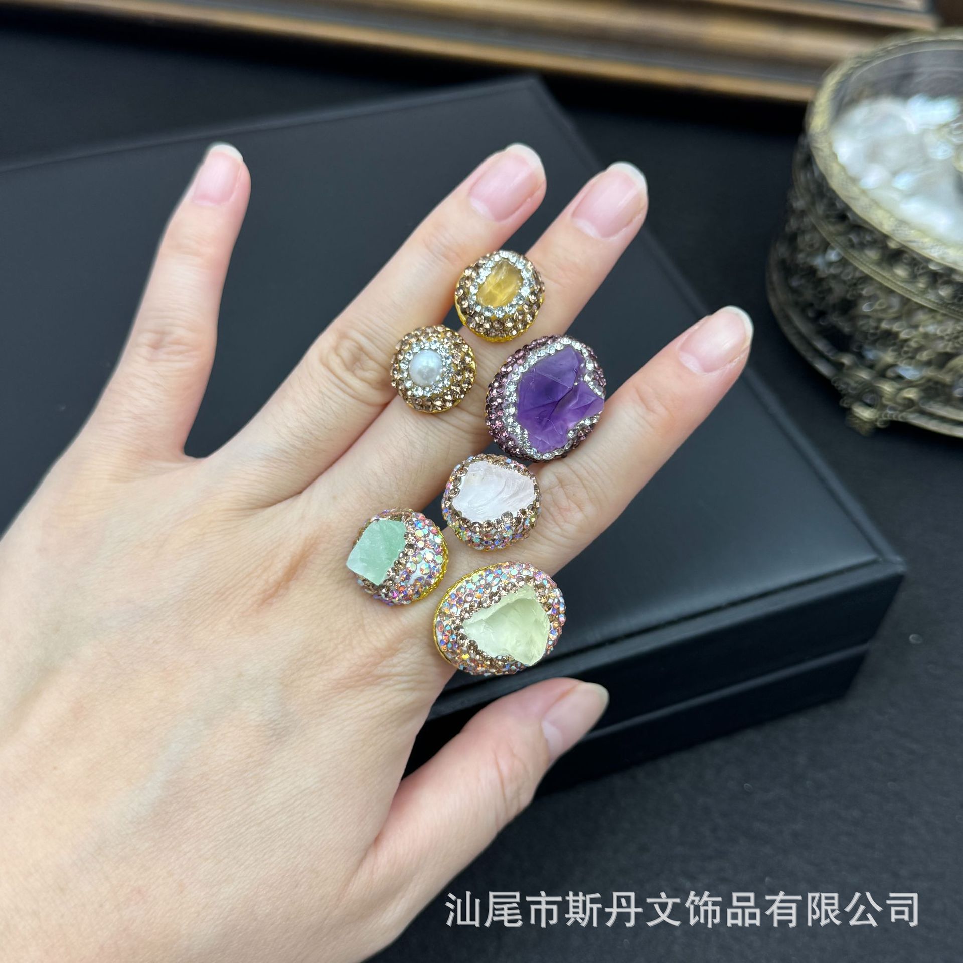 新款原石紫水晶镶嵌珍珠戒指时尚个性中古小众轻奢高级感点钻饰品