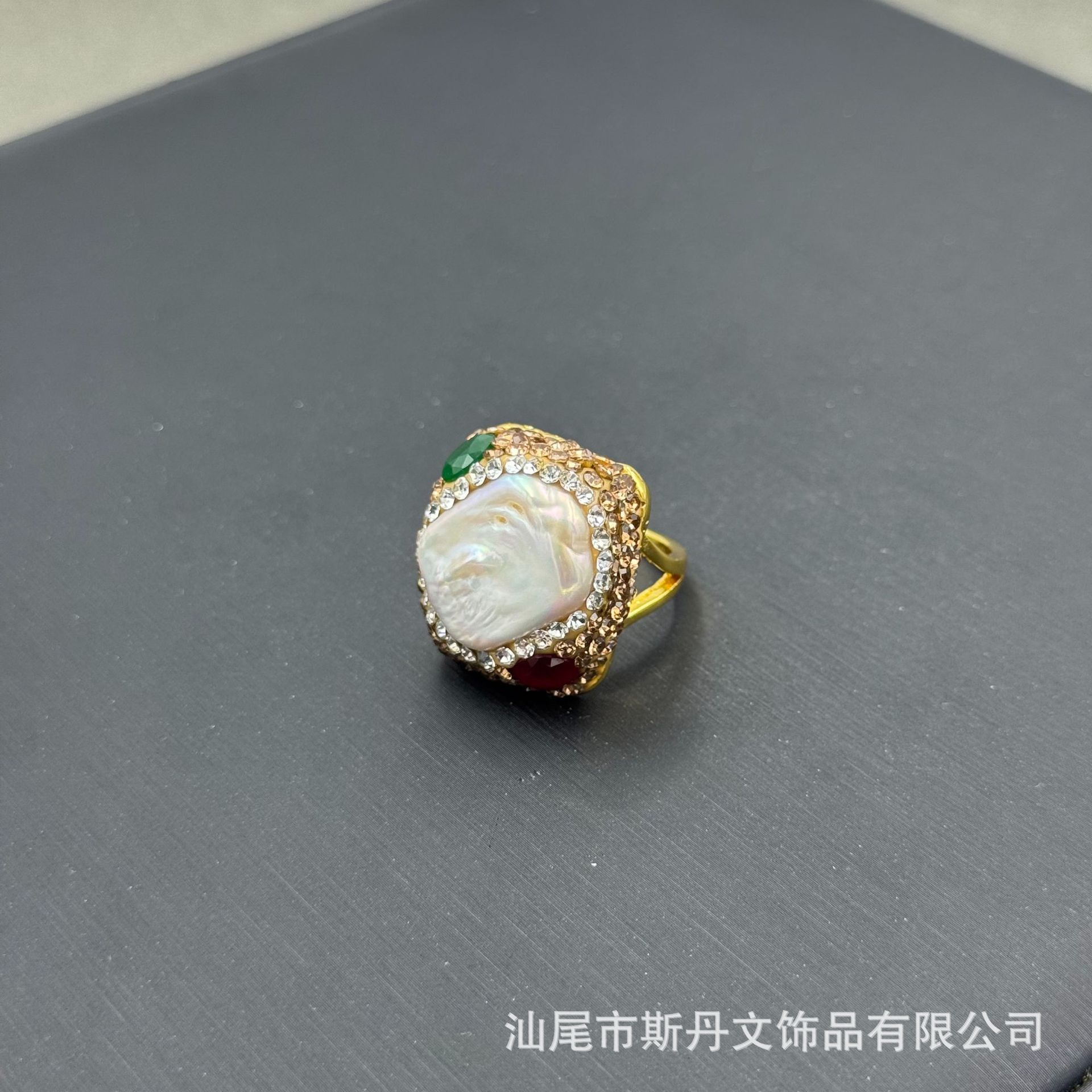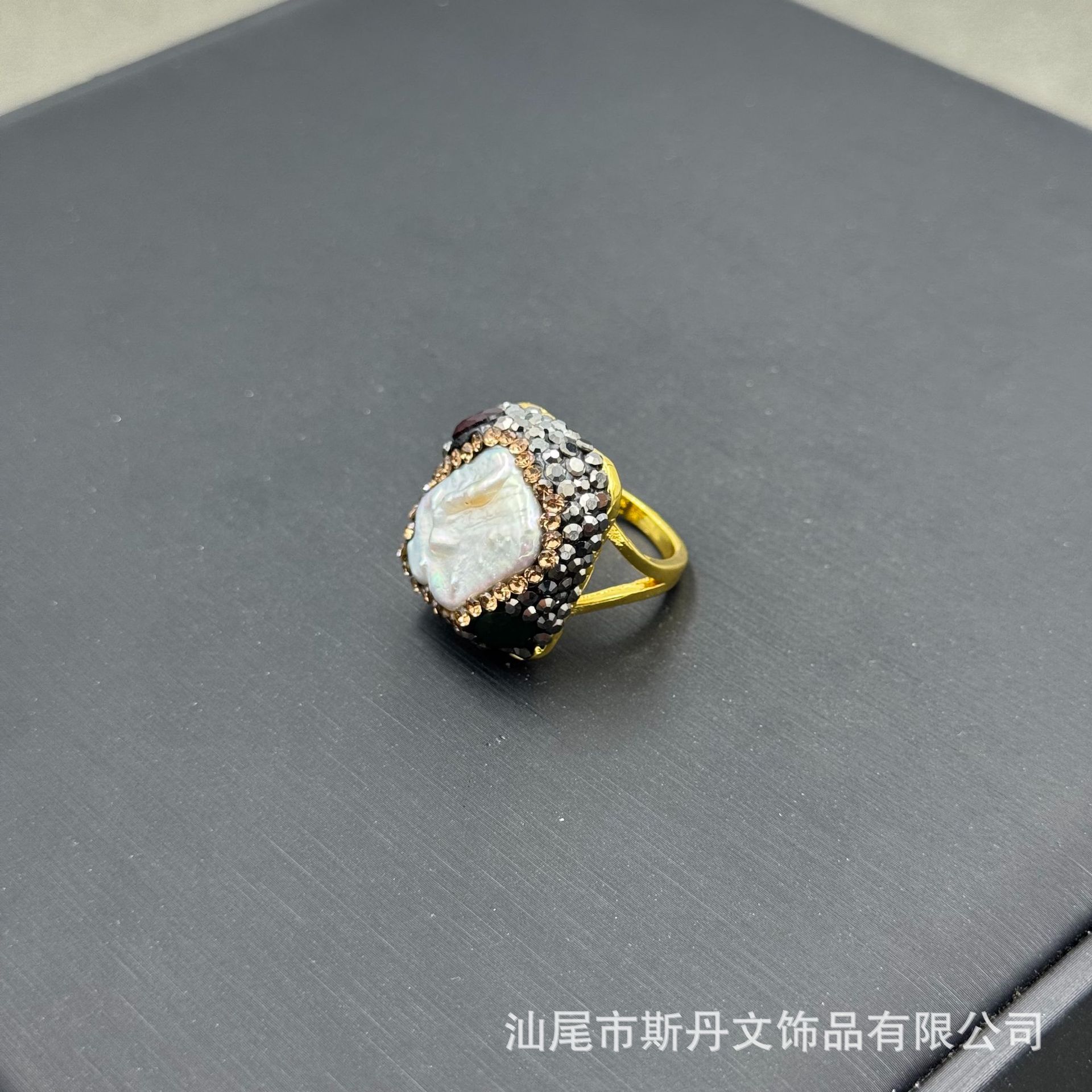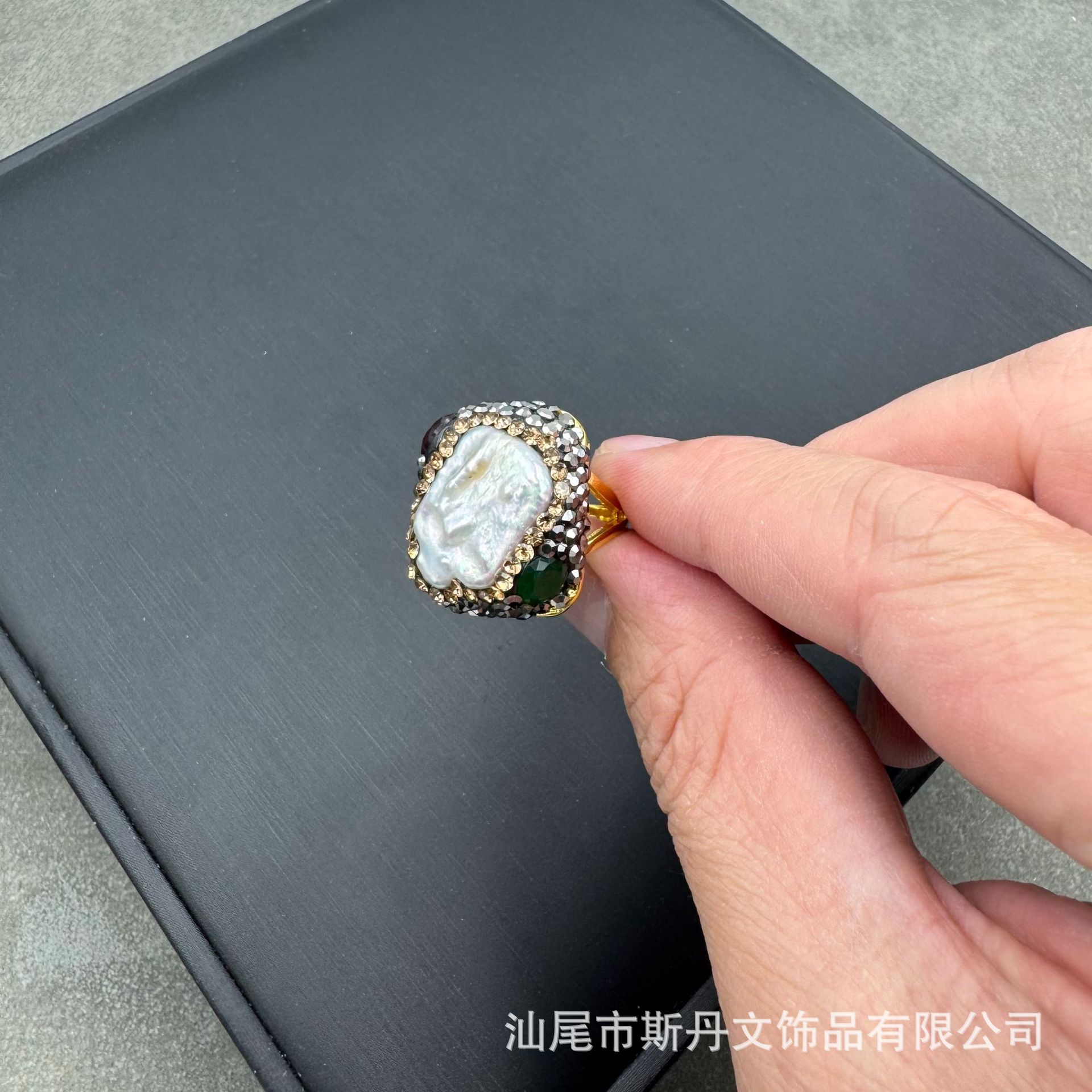 新款天然彩光贝壳镶嵌原石戒指个性轻奢饰品指环手工镶钻工厂批发
