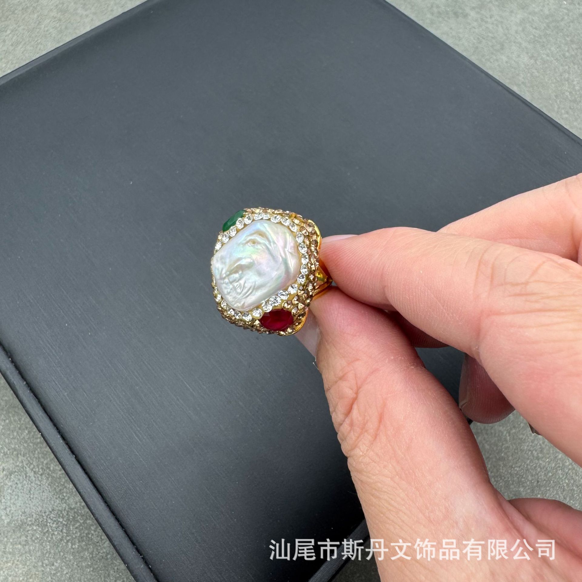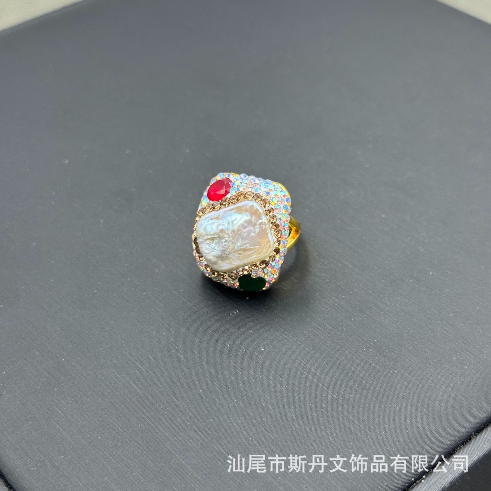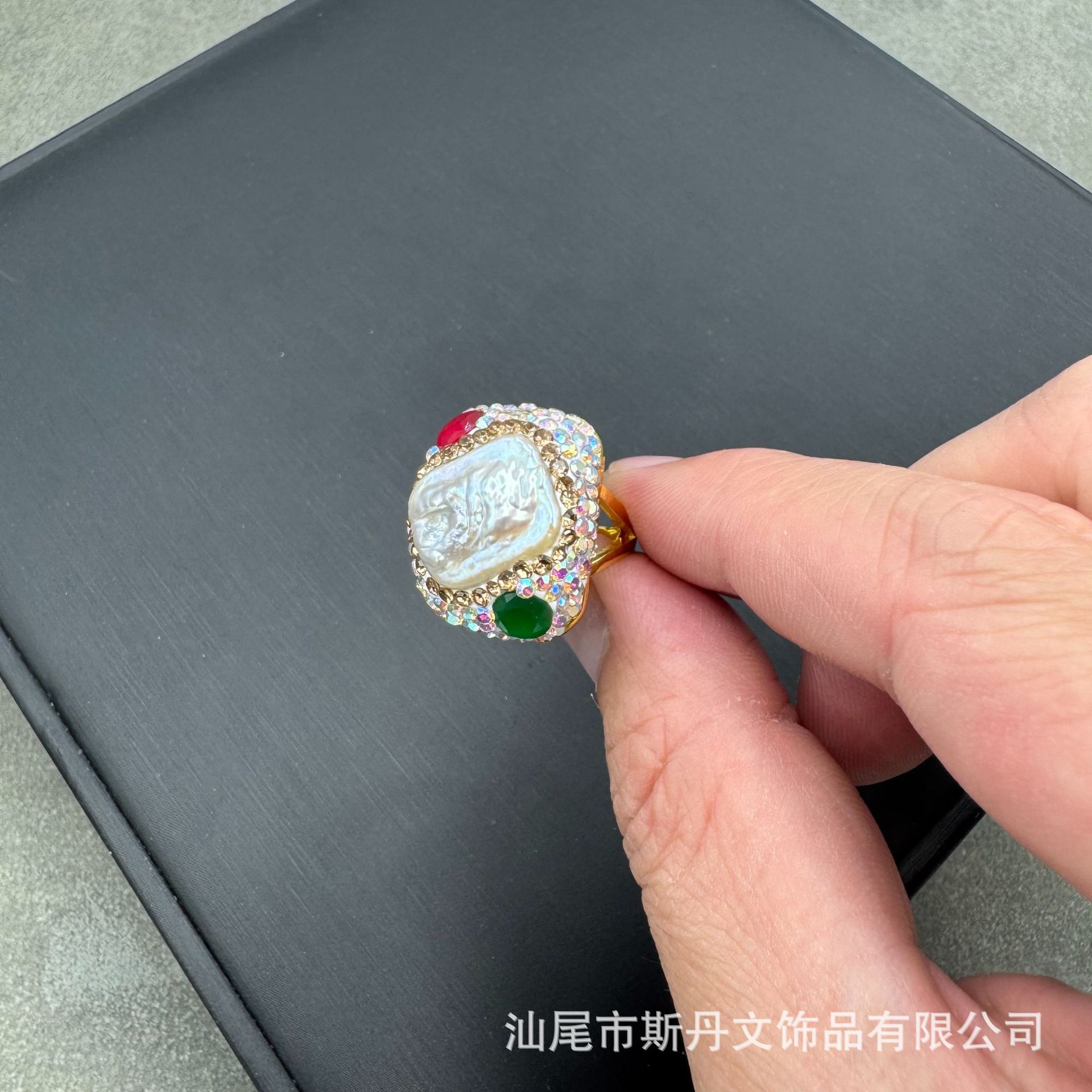 新款天然彩光贝壳镶嵌原石戒指个性轻奢饰品指环手工镶钻工厂批发
