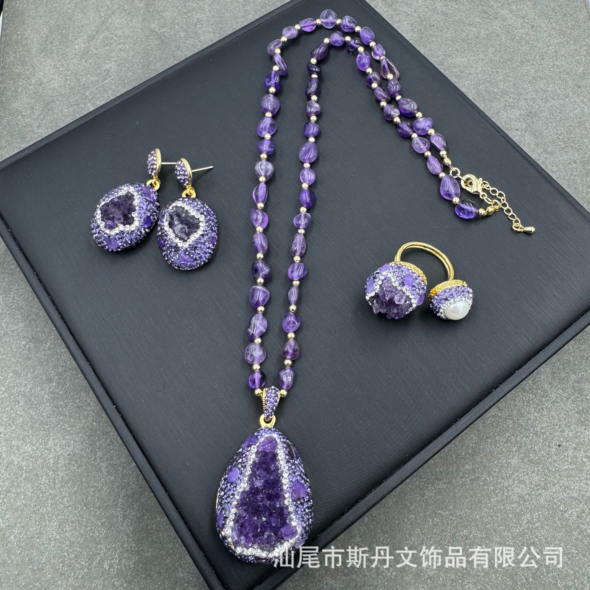 天然原石紫晶花四点セット欧米フランス個性原鉱アクセサリー毛衣チェーン高級手作りセット
