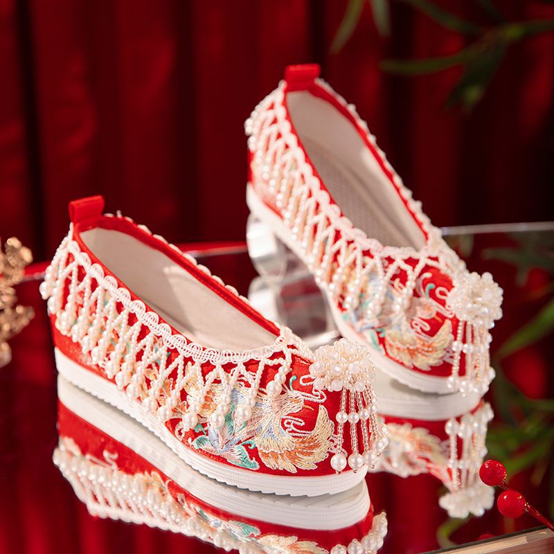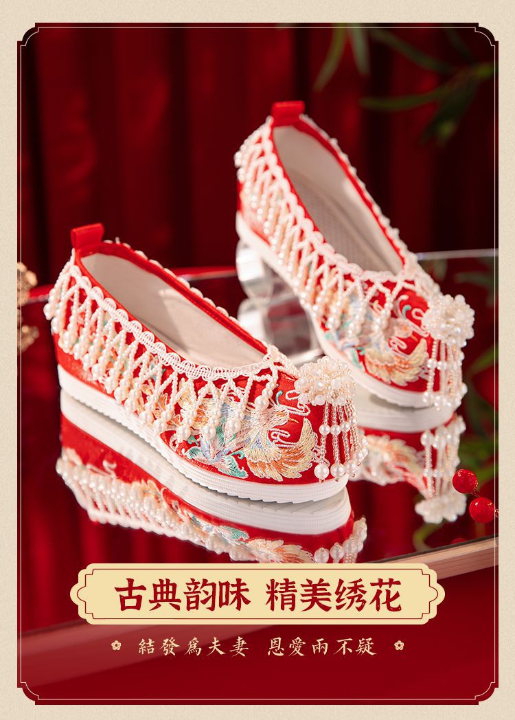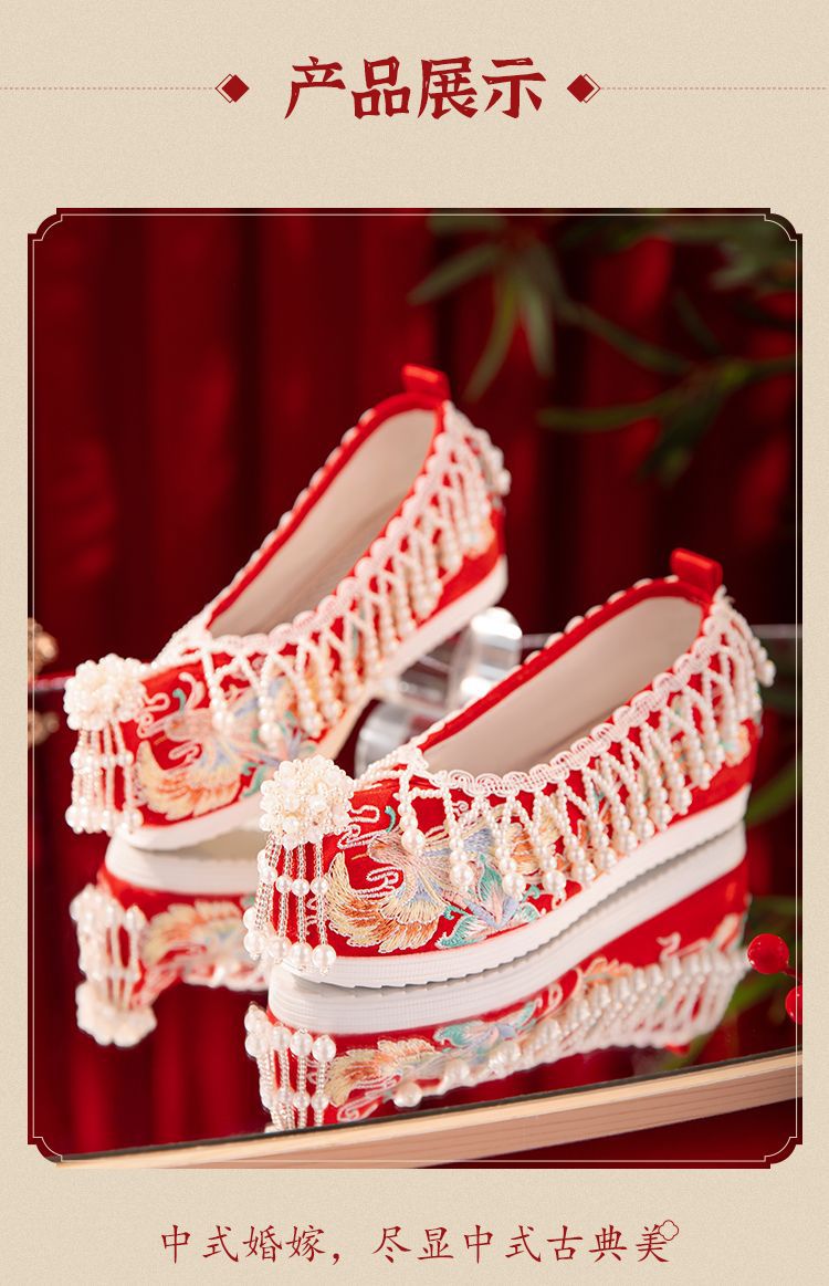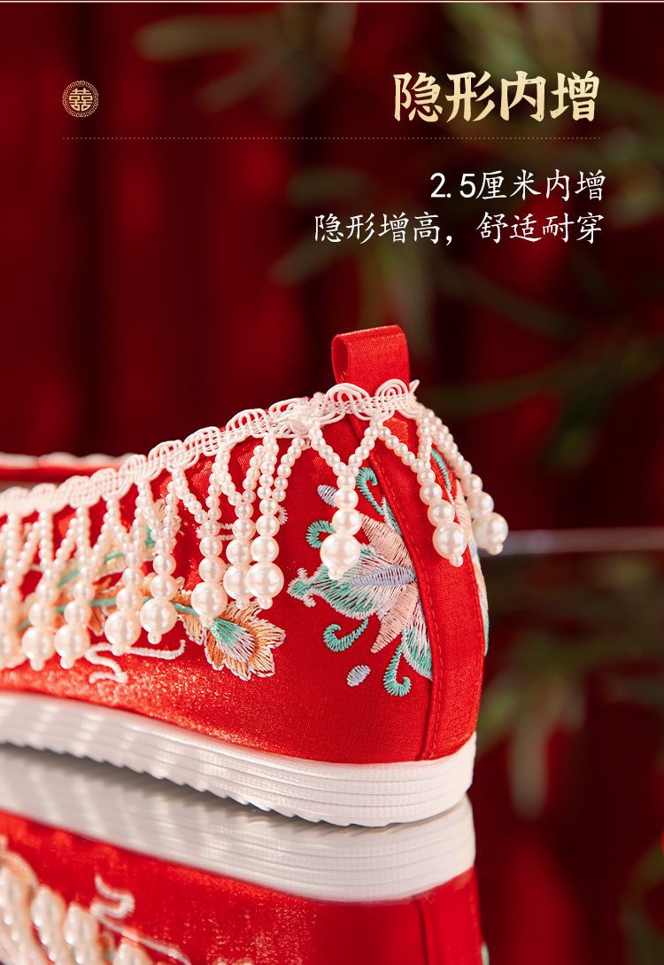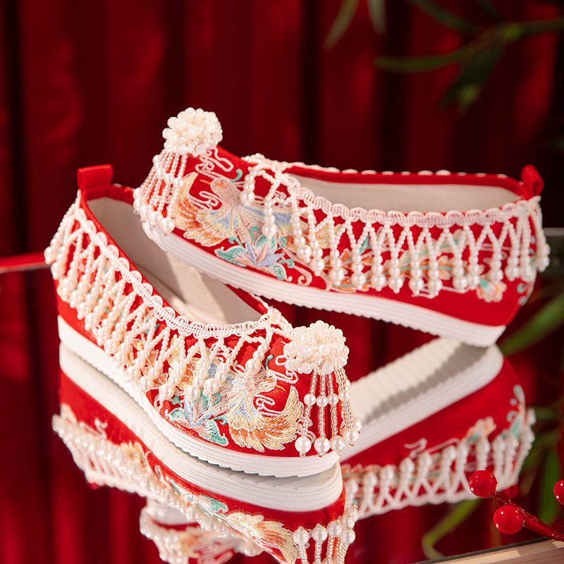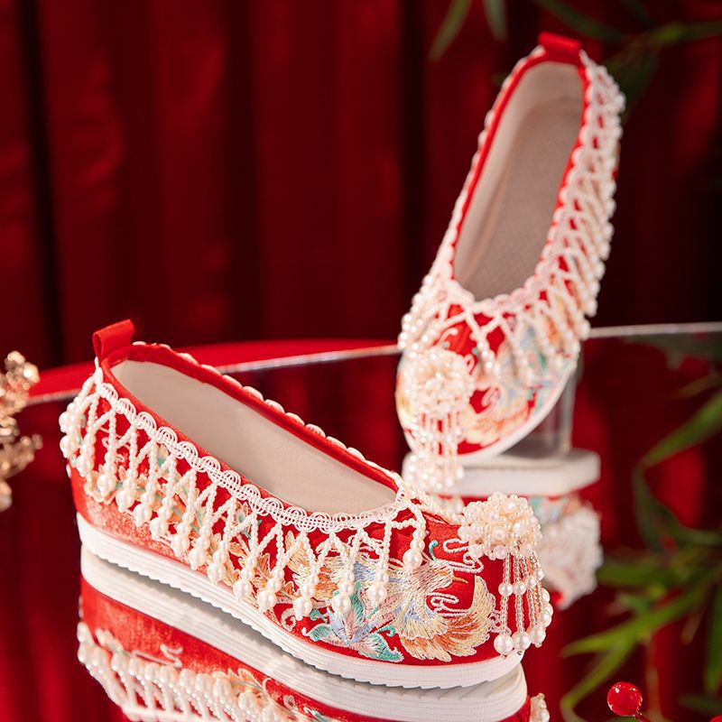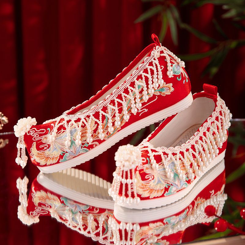 漢服秀和の女性用ウェディングシューズ、古代風のウェディングシューズ、女性用ウェディングシューズ、フラットレッド刺繍シューズ、インナー高さアップ