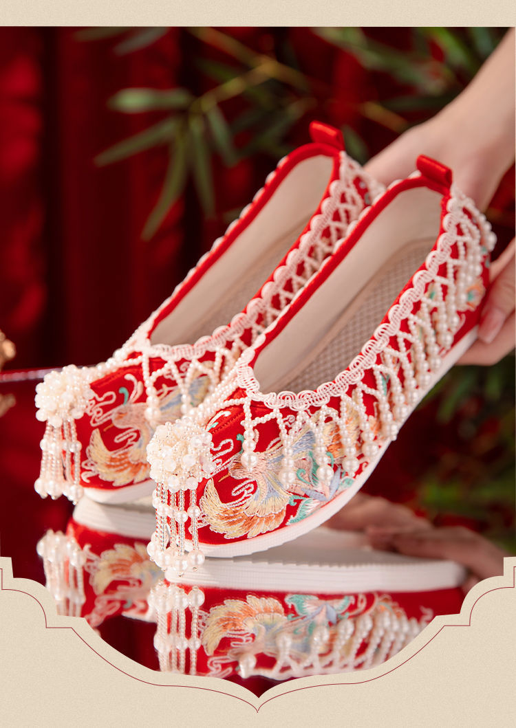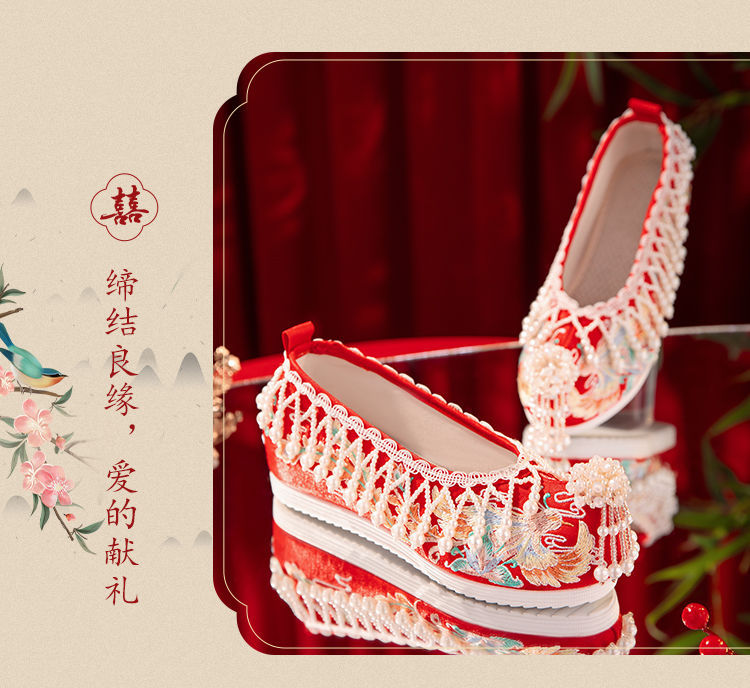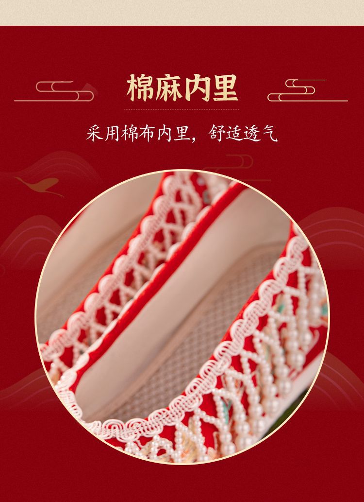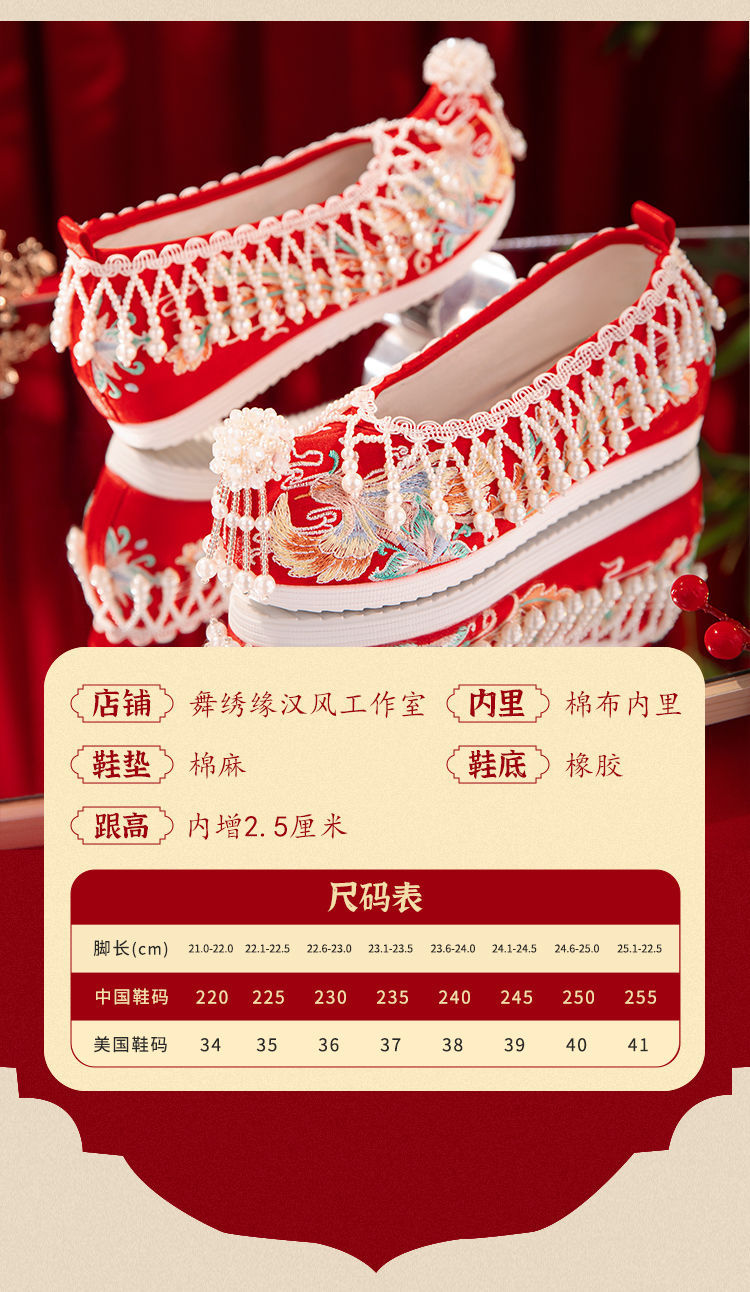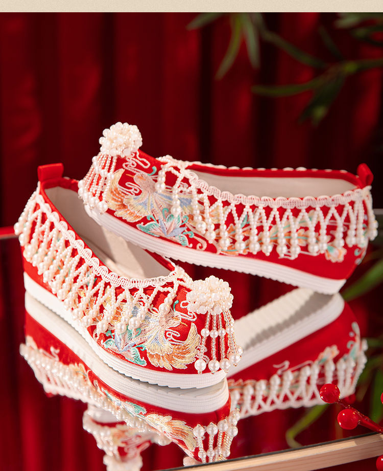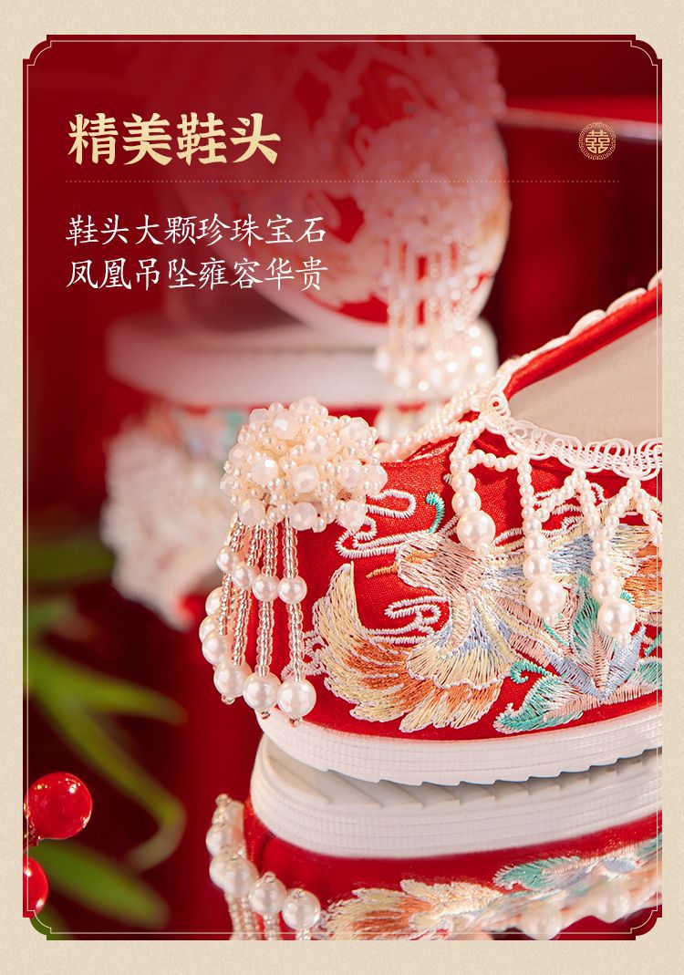 漢服秀和の女性用ウェディングシューズ、古代風のウェディングシューズ、女性用ウェディングシューズ、フラットレッド刺繍シューズ、インナー高さアップ