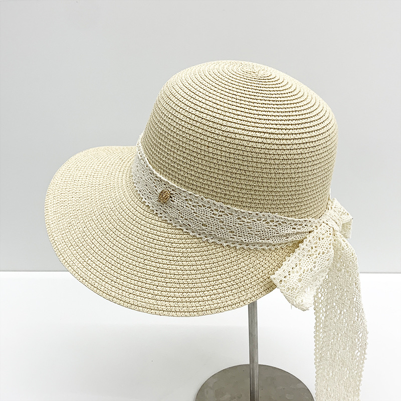 新しい韓国レースリボン麦わら帽子、エレガントでエレガントな大きなつばの日焼け止め麦わら帽子、旅行休暇帽子