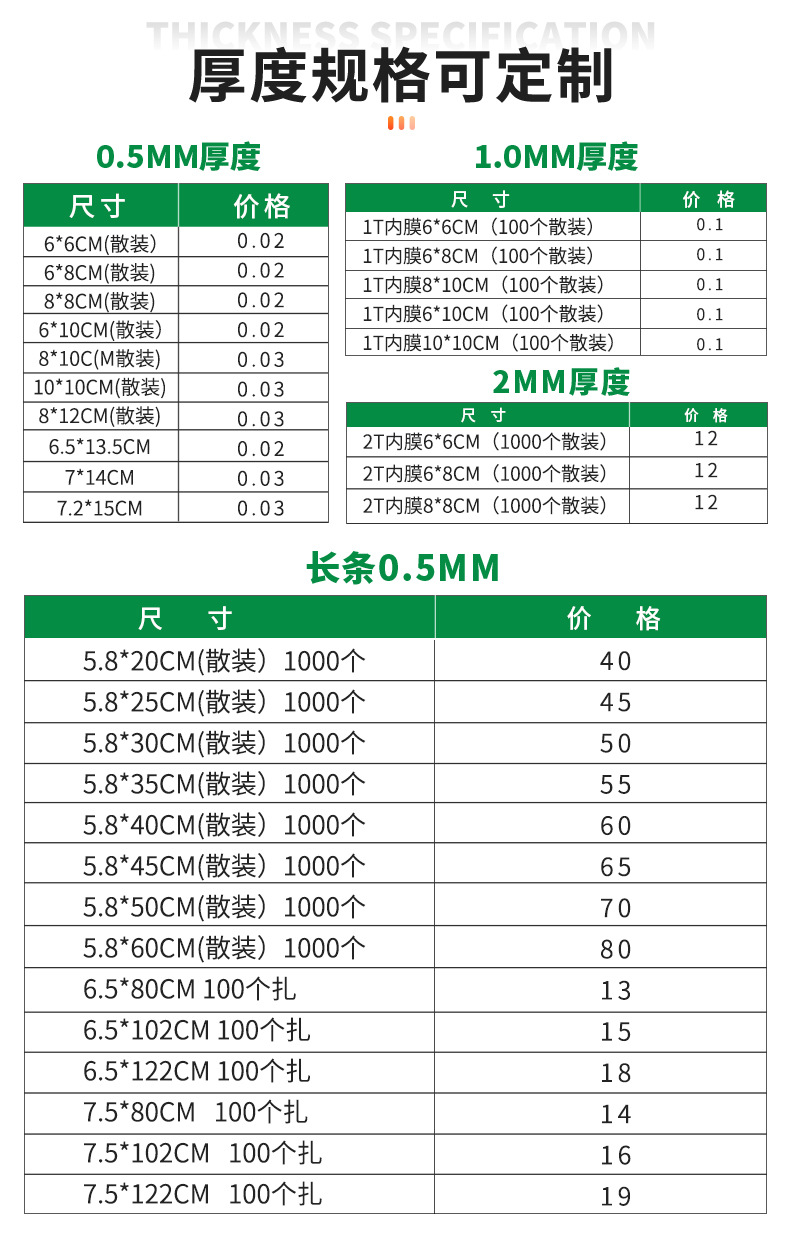 カスタマイズされた仕様,1T 内膜 6*8CM (バルク 100 個),1T 内膜 6*10CM (バルク 100 枚),1T 内膜 10*10CM (バルク 100 枚),1T 内膜 8*12CM (バルク 100 個),1T 内膜 10*12CM (バルク 100 枚),1T 内膜 12*12CM (バルク 100 個),1T 内膜 10*15CM (バルク 100 枚),1T 内膜 17*17CM (100 枚),1T 内膜 15*20CM (100 枚),1T 内膜 20*20CM (100 枚),1T 内膜 20*25CM (50 枚),1T 内膜 10*30CM (100 枚),1T 内膜 30*38CM (50 枚),1T 内膜 8*8CM (バルク 100 個),1T 内膜 6*6CM (バルク 100 個),1T 内膜 8*10CM (バルク 100 個)),1T 内膜 6.5*14CM (バルク 100 枚),1T 内膜 13*15CM (50 枚),1T 内膜 25*35CM (50 枚),1T 内膜 25*30CM (50 枚),1T内膜 56.5×41cm (50枚)
