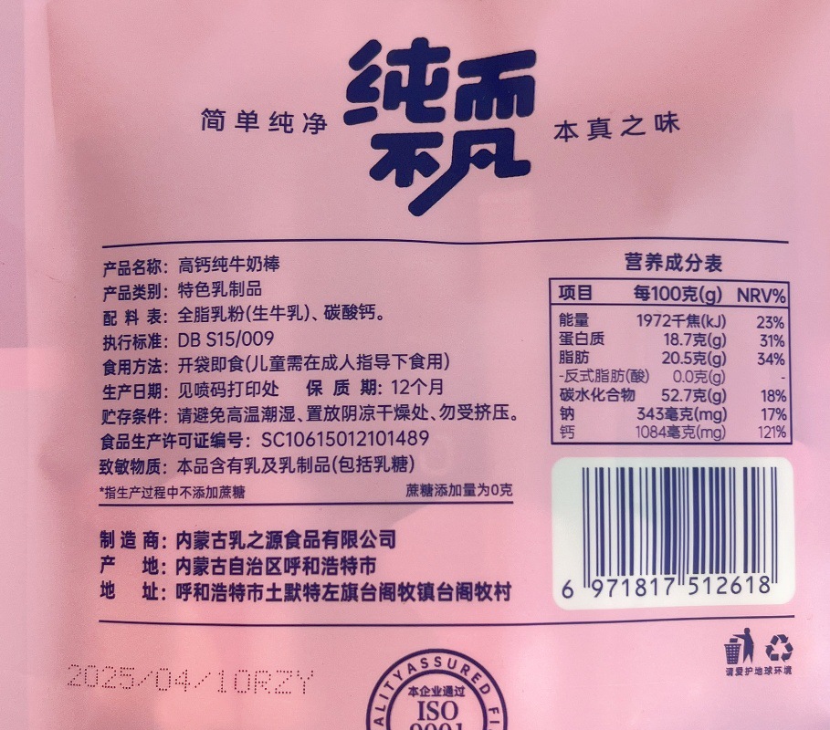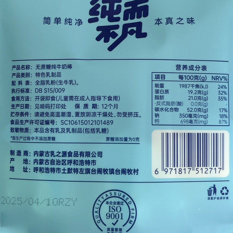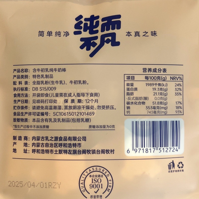 ゼロショ糖純牛乳棒乳貝高カルシウム高蛋白独立包装内モンゴル特産児童ミルク食品