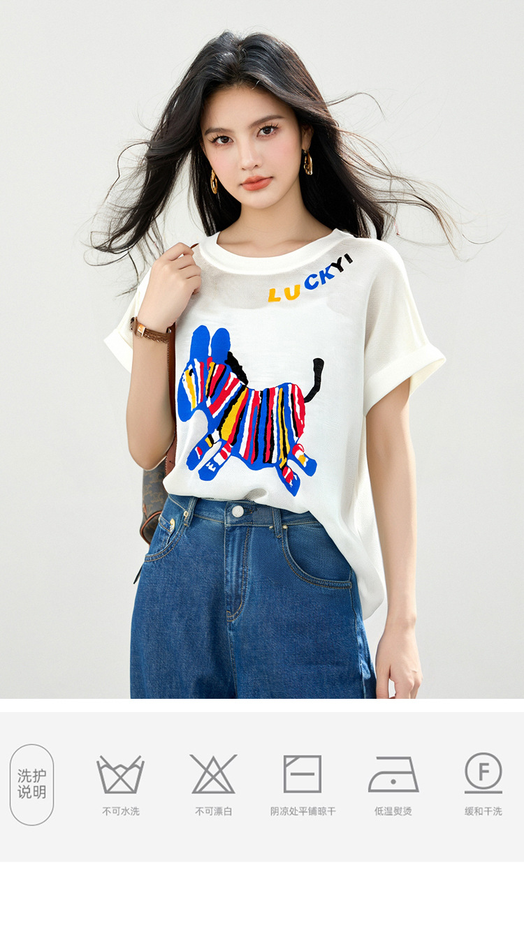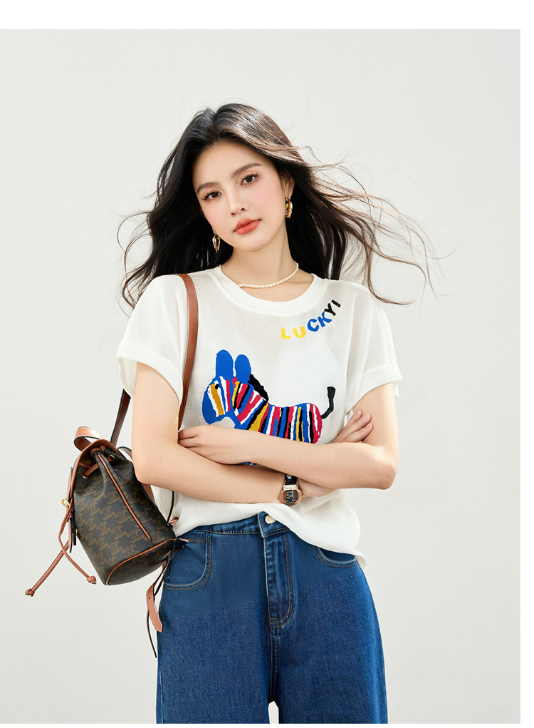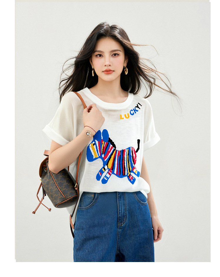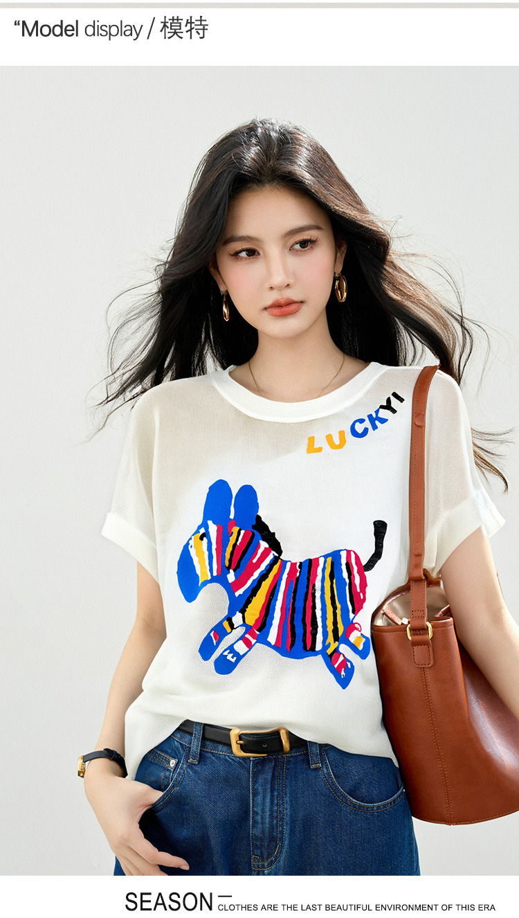2025 夏ラウンドネック漫画デザインアイスシルク薄いルーズニット半袖 Tシャツトップ