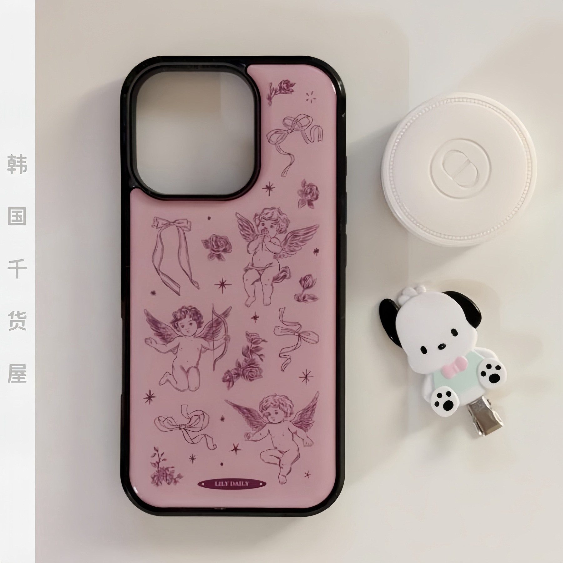 Lilydaily韓国レトロ小衆創意ピンク小天使黒辺滴ゴム殻全包携帯ケース