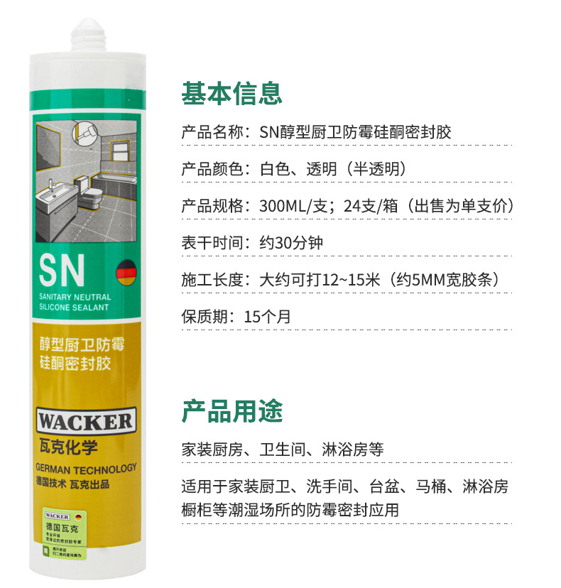 ドイツのWACKER社製SNキッチン&バスルーム用防水・防カビガラス接着剤、トイレ・洗面台用シーラント、磁器白軟質接着剤、透明