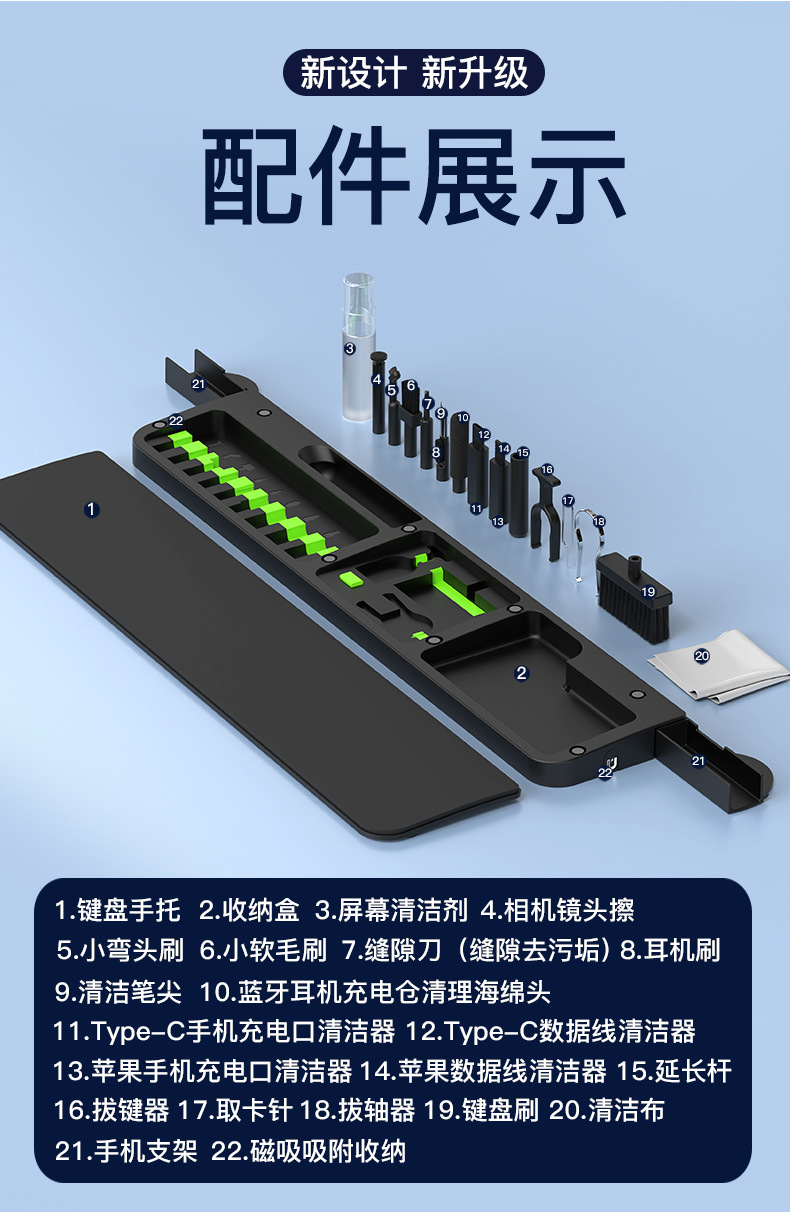 クロスボーダー新型QS22二十二合一多機能清潔セットキーボードの手は革のスポンジの事務の腕を支えます。