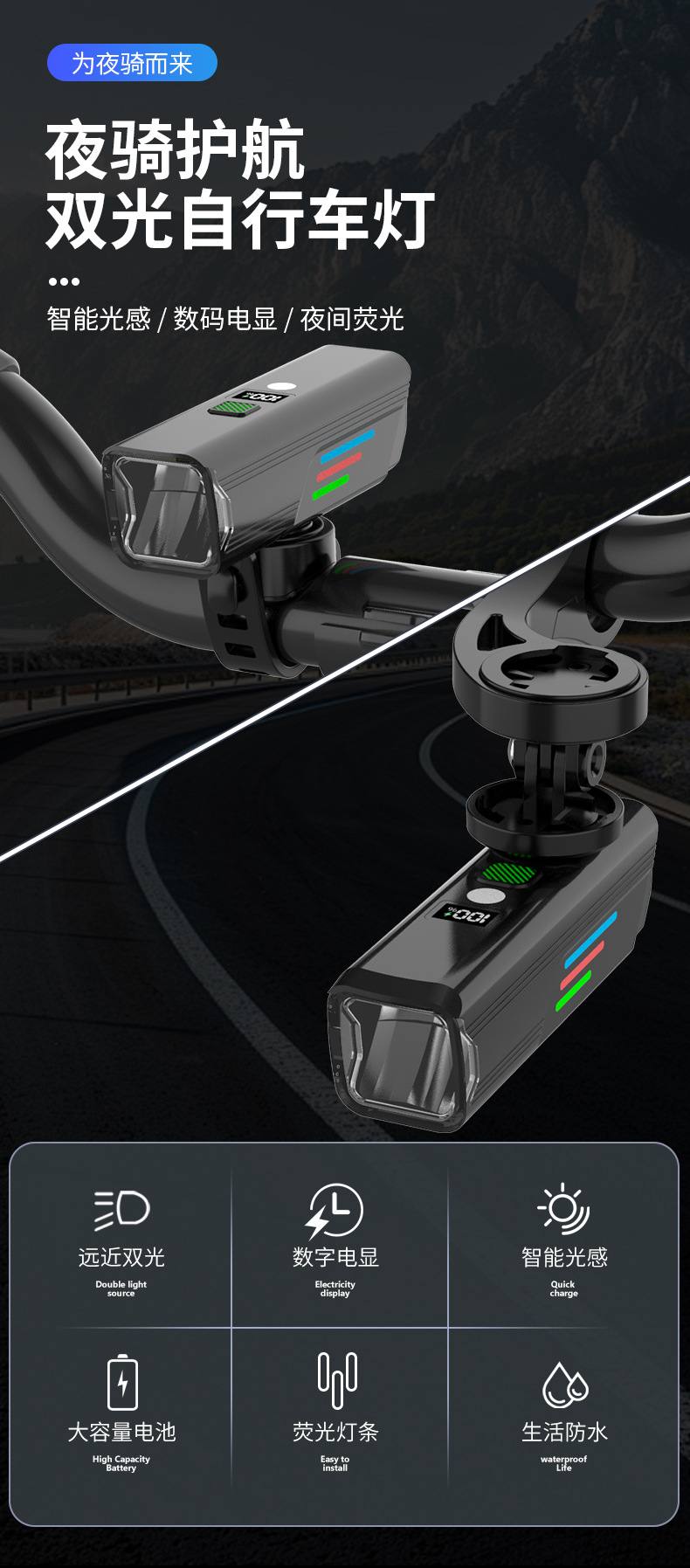 自転車ライト、ロードバイク、マウンテンバイク、アウトドアライディング、高輝度ライディング照明、光感知LCDデジタルディスプレイライディングライト