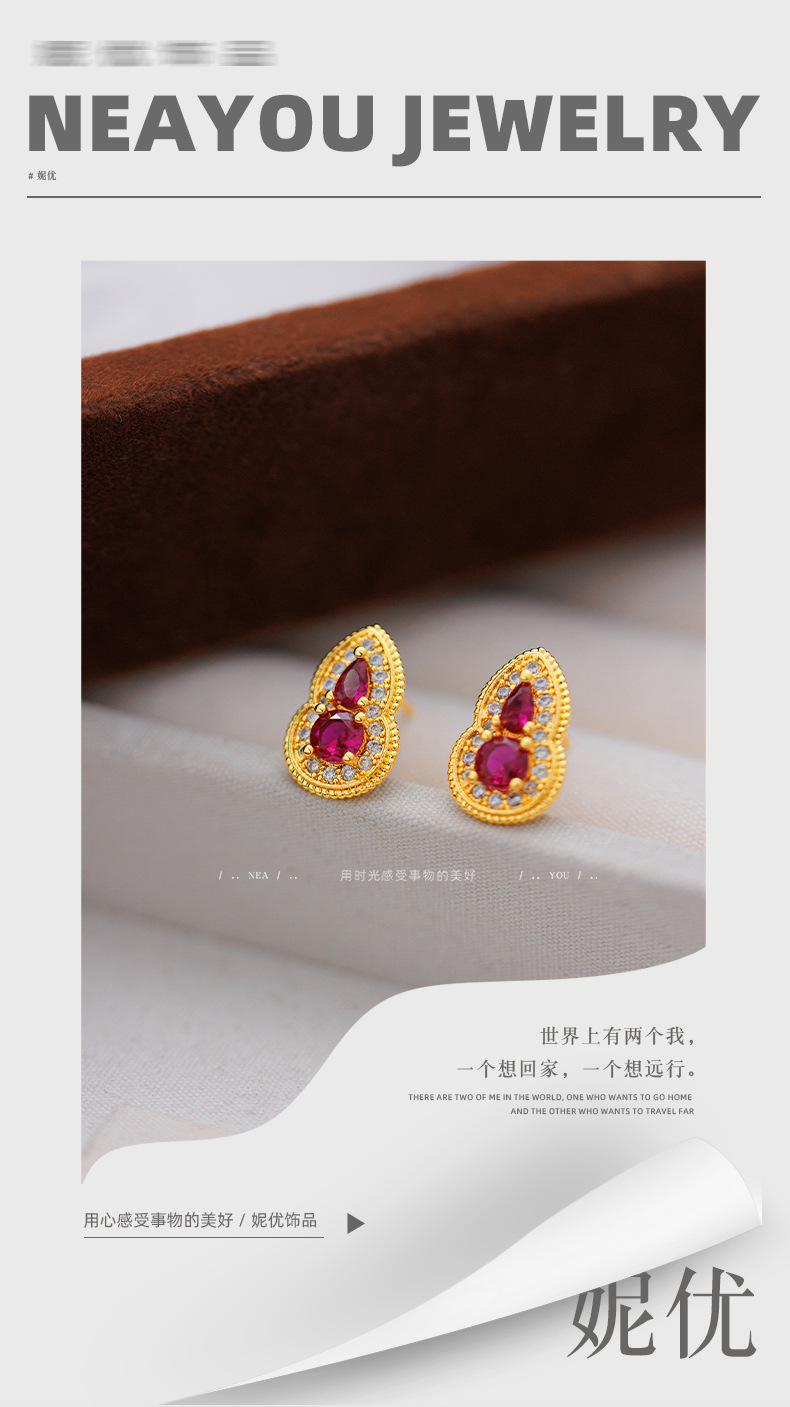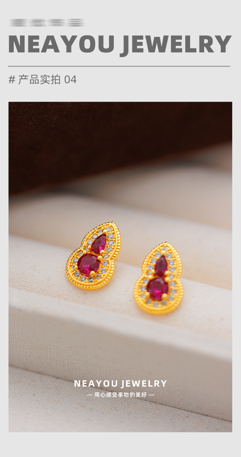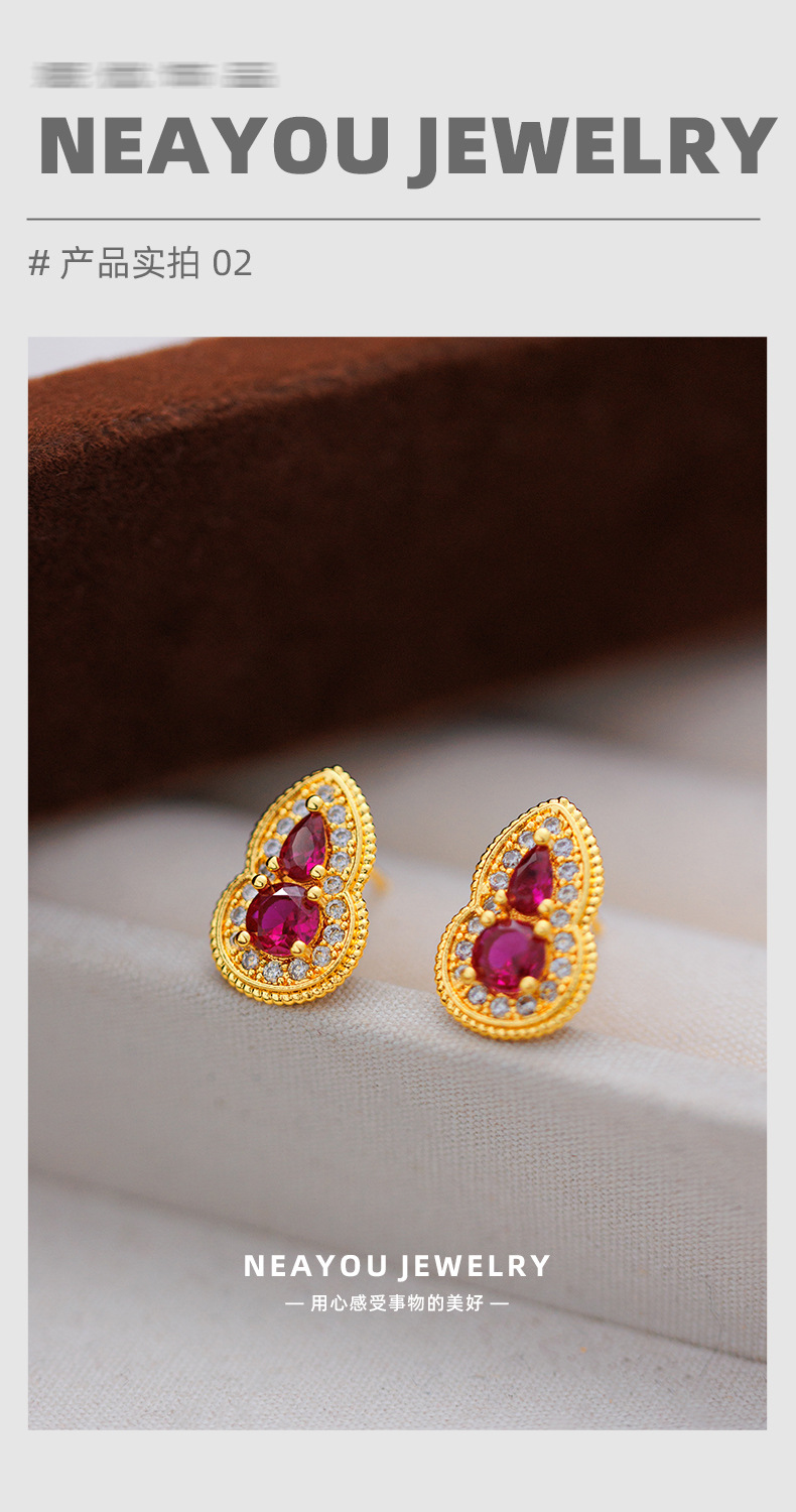 新しい中国風のデザインの女性のひょうたんイヤリング、軽い豪華さとハイエンドのサンドゴールドローズレッドジルコンドットダイヤモンドフーリュイヤリング