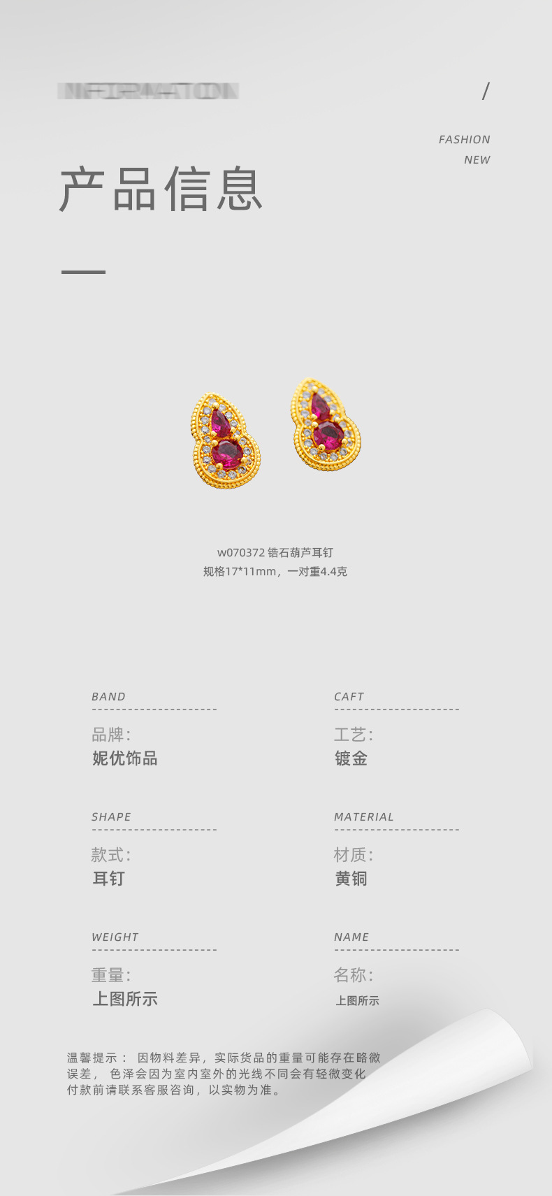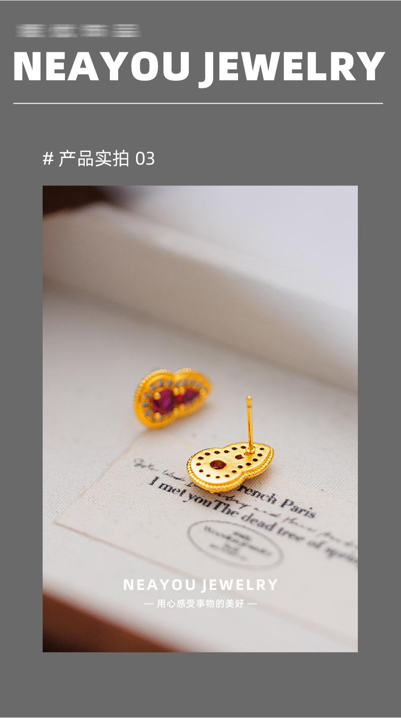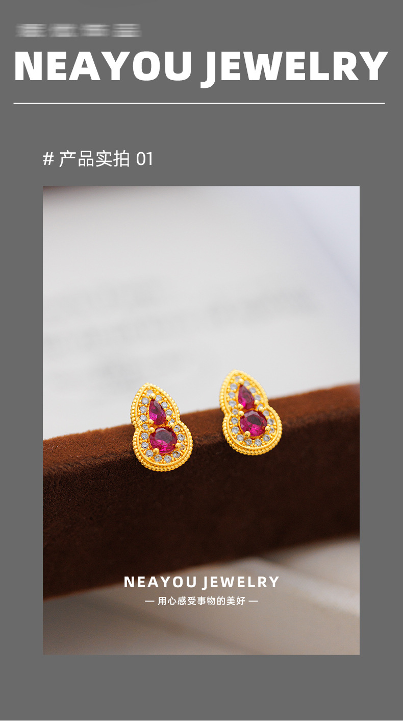 新しい中国風のデザインの女性のひょうたんイヤリング、軽い豪華さとハイエンドのサンドゴールドローズレッドジルコンドットダイヤモンドフーリュイヤリング