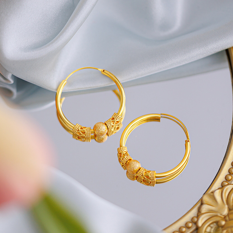 デザイン感レトロ回転ビーズイヤリング耳輪ベトナム沙金模造金女透かし入りビーズ気質百合イヤリング