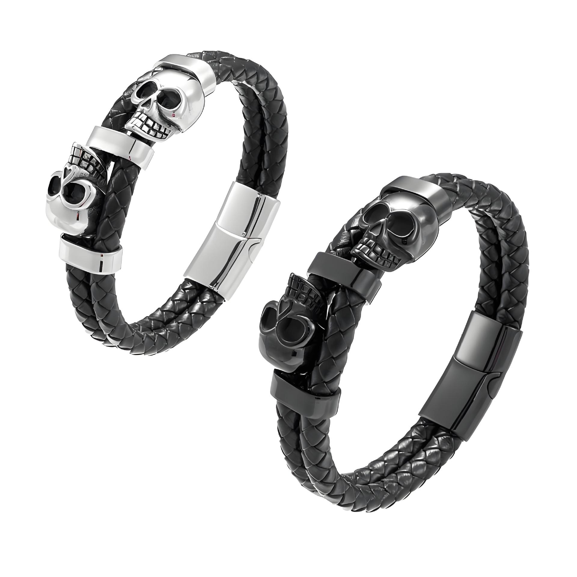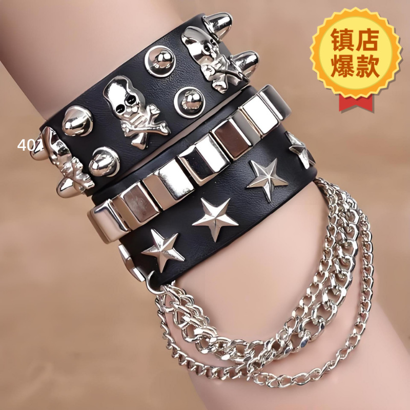 アマゾンは欧米のファッションの多層の皮の幅のブレスレットの個性の覇気のスカルのリベットのパンクの街のダンスのブレスレットを売ります。