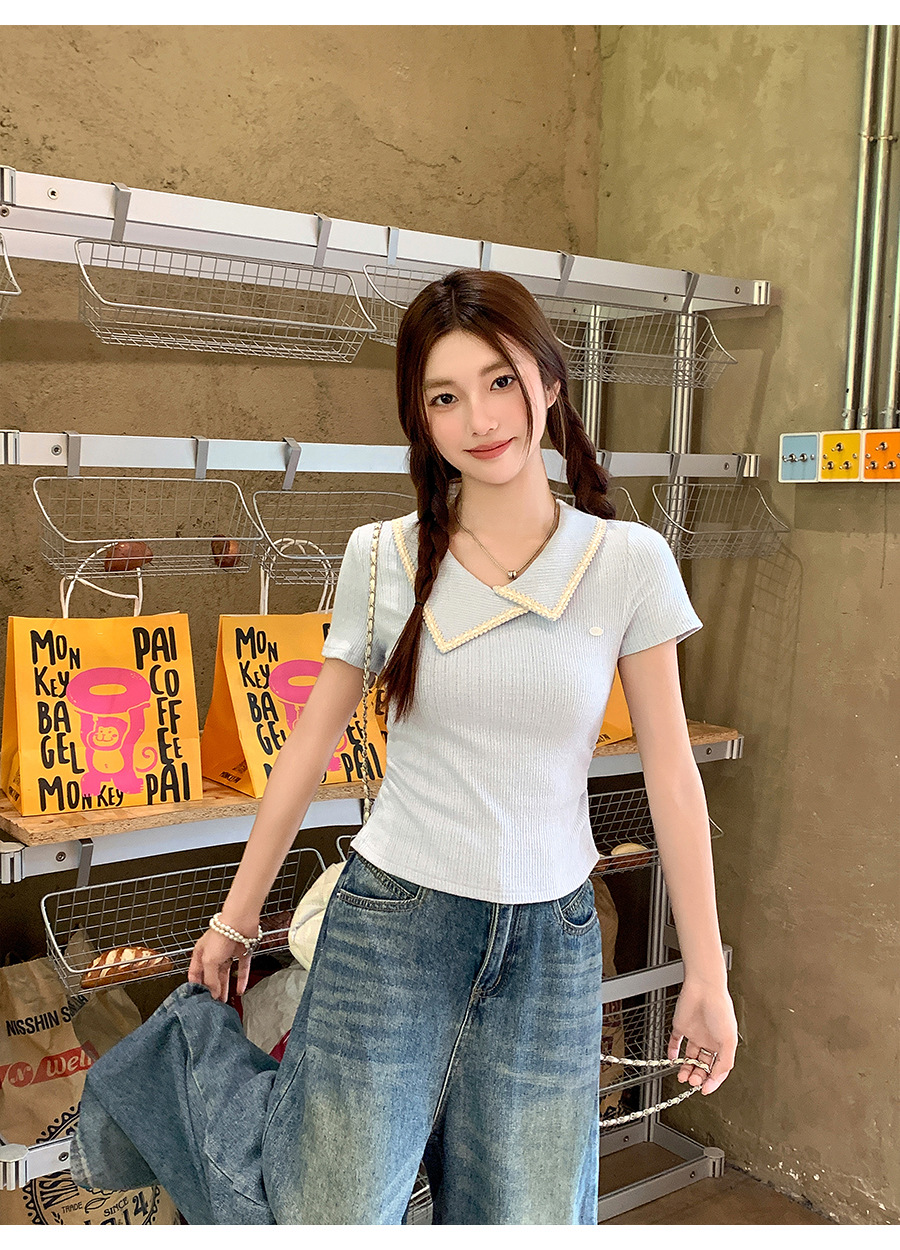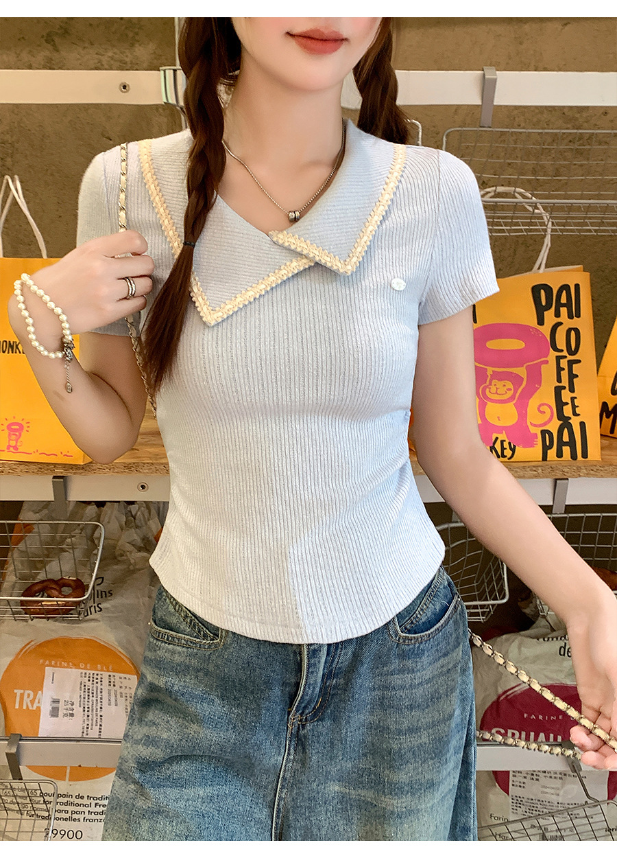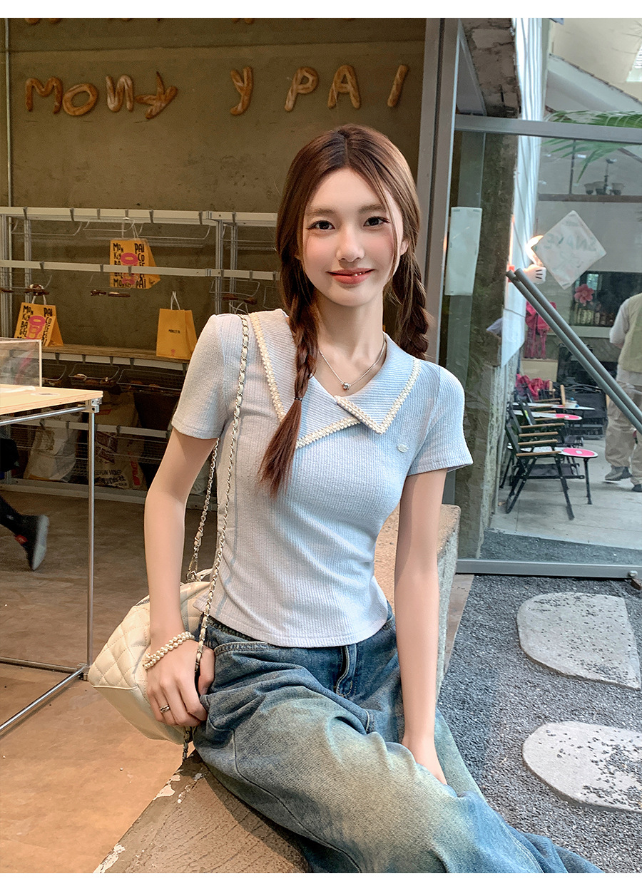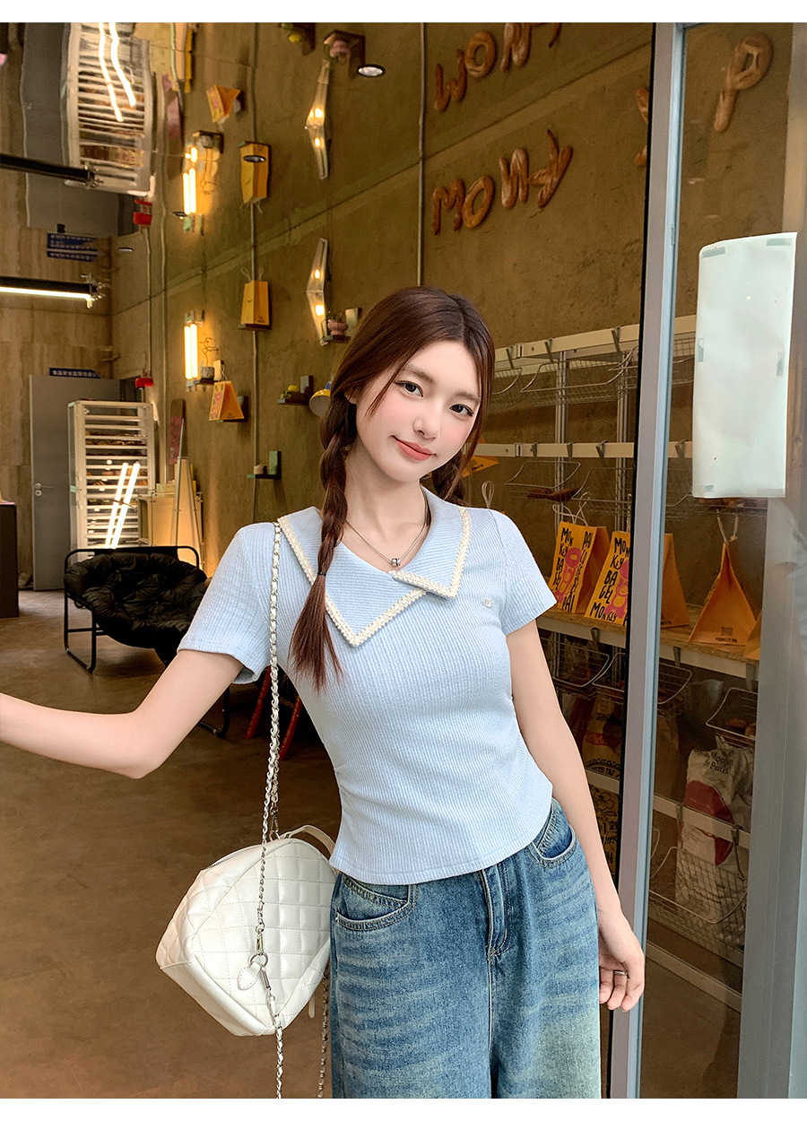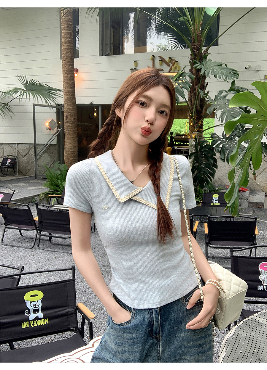 不規則なラペル半袖 T シャツ女性のための夏 2025 新しいデザインプリーツウエスト痩身右肩ショートトップ
