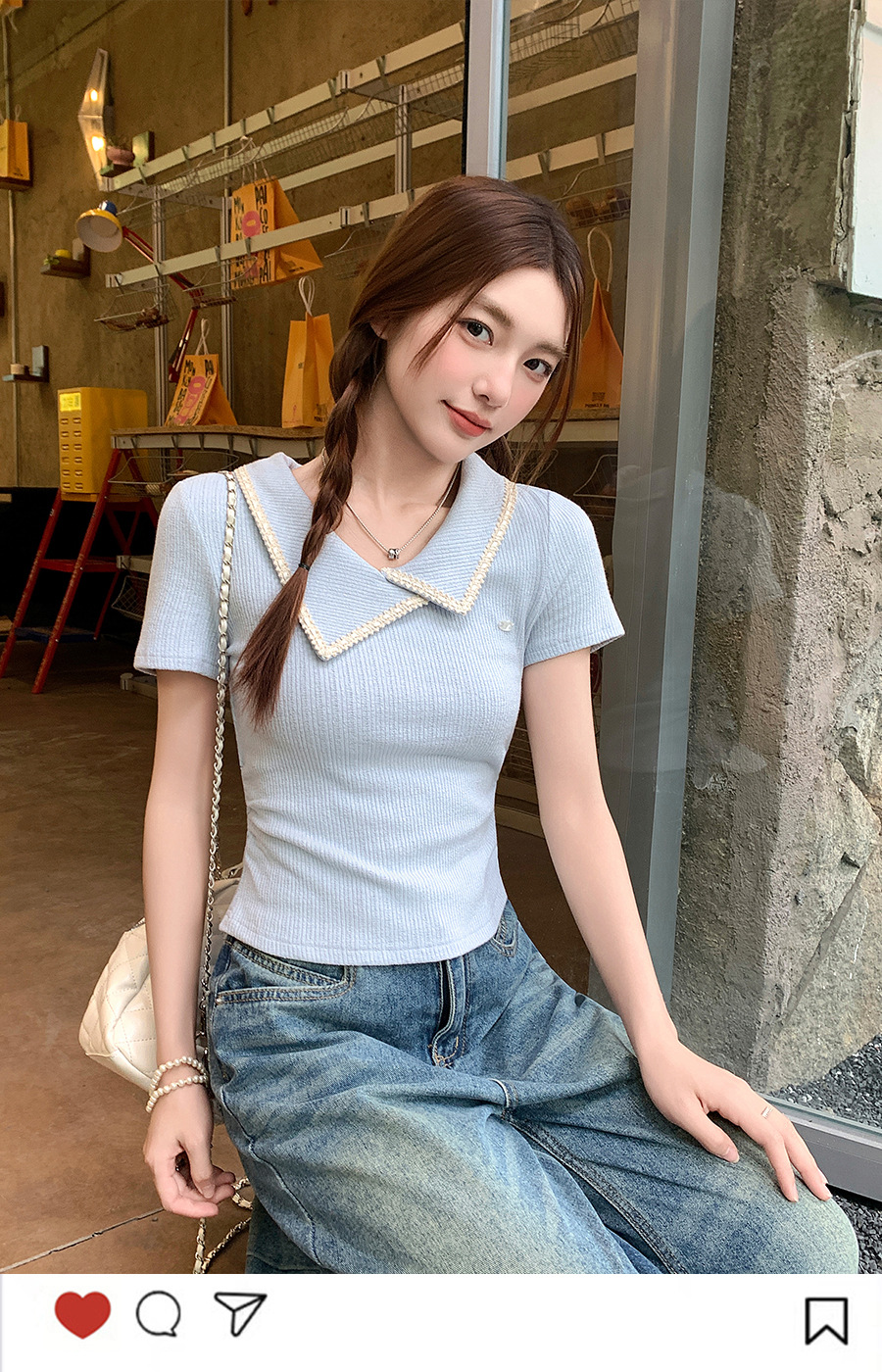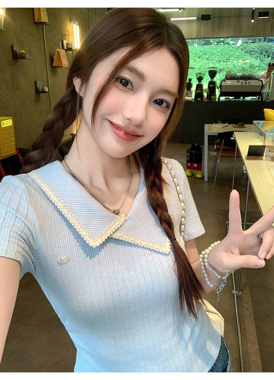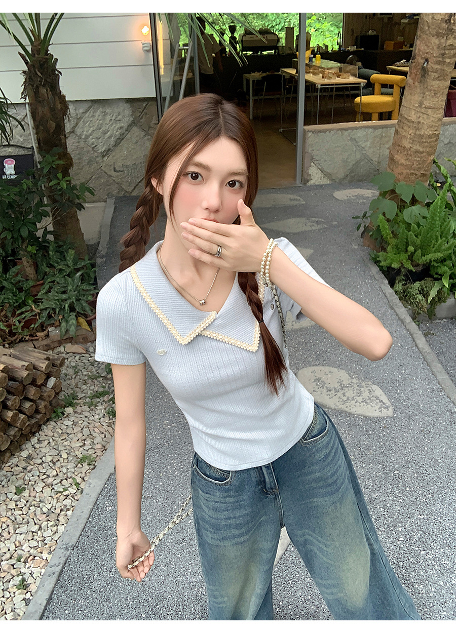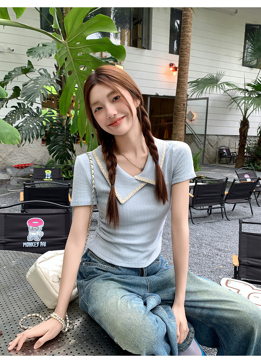 不規則なラペル半袖 T シャツ女性のための夏 2025 新しいデザインプリーツウエスト痩身右肩ショートトップ