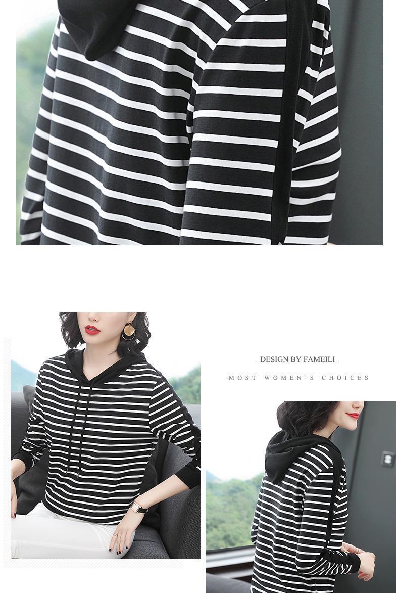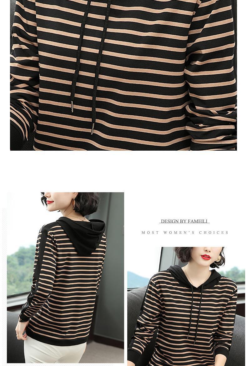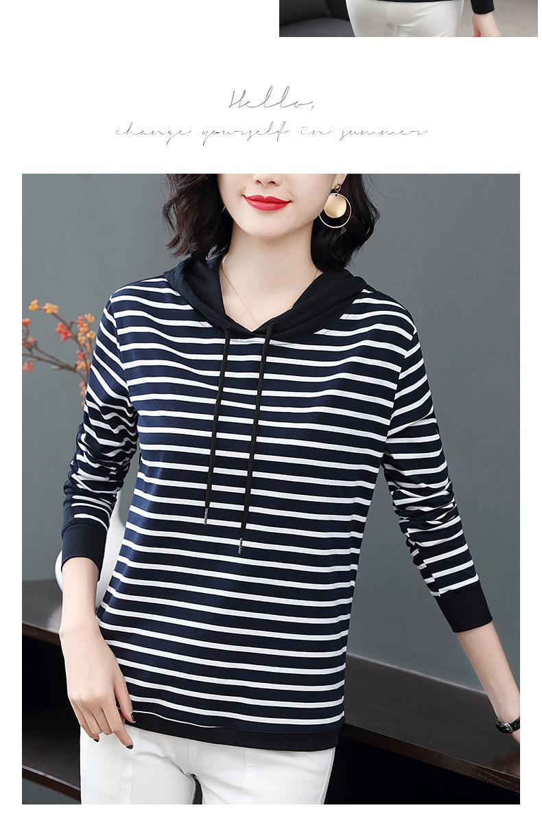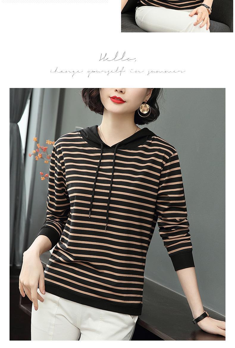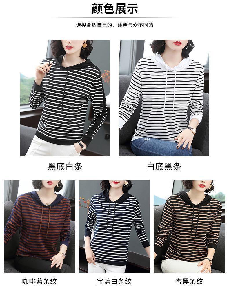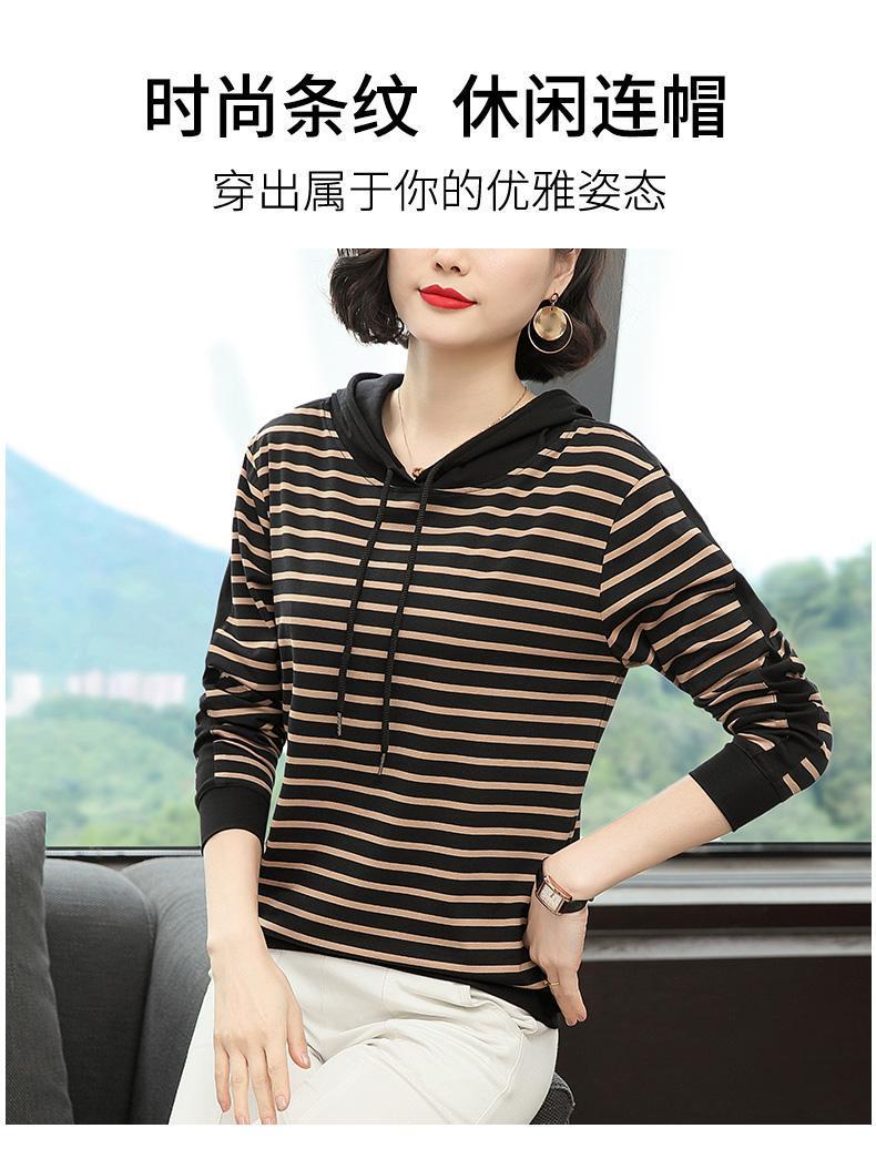 时尚条纹连帽长袖T恤2025春秋新款百搭大码女装显瘦文艺复古上衣