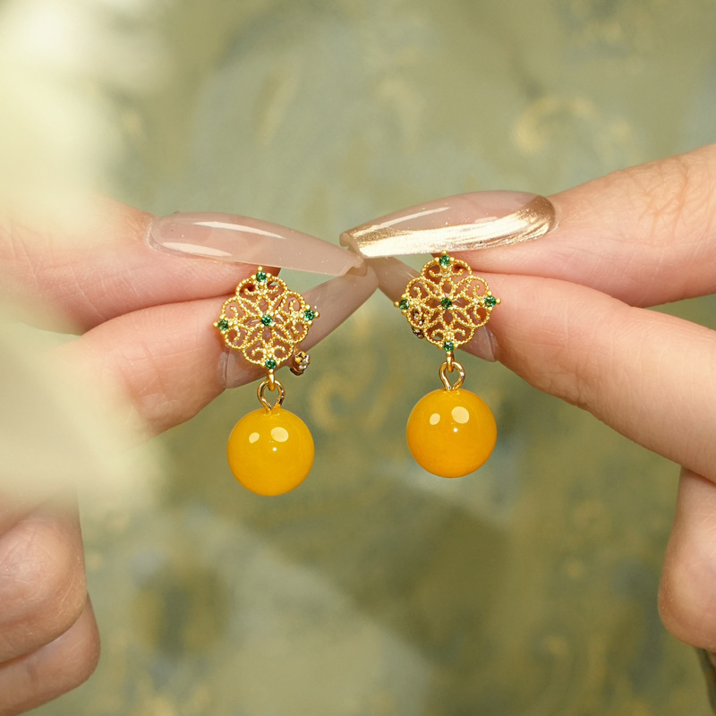 复古宫廷新中式仿蜜蜡珍珠耳环女高级感菱形花纹绿锆耳钉古风耳饰