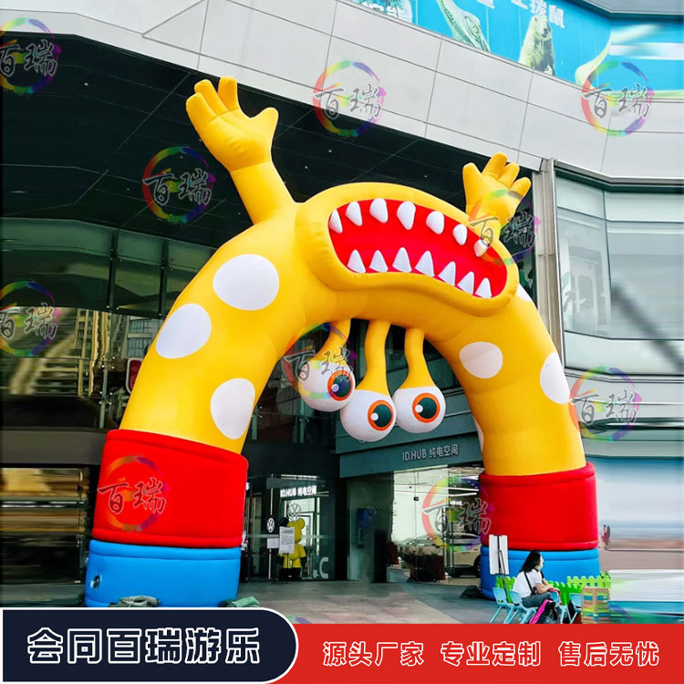漫画の黄色の小さい怪獣の目のアーチの空気のモデルの活動の入り口の子供の遊びのインタラクティブな写真撮影の配置の道具