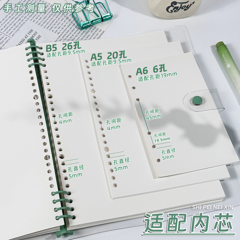 规格 a6丨6孔丨孔间距19.5mm,a5丨8孔丨孔间距4mm,b5丨8孔丨孔间距4mm