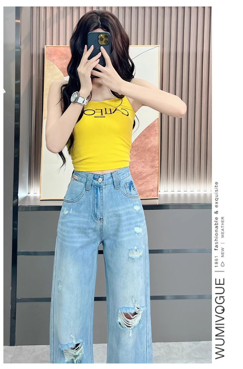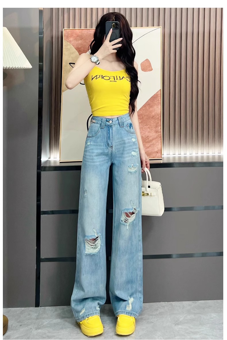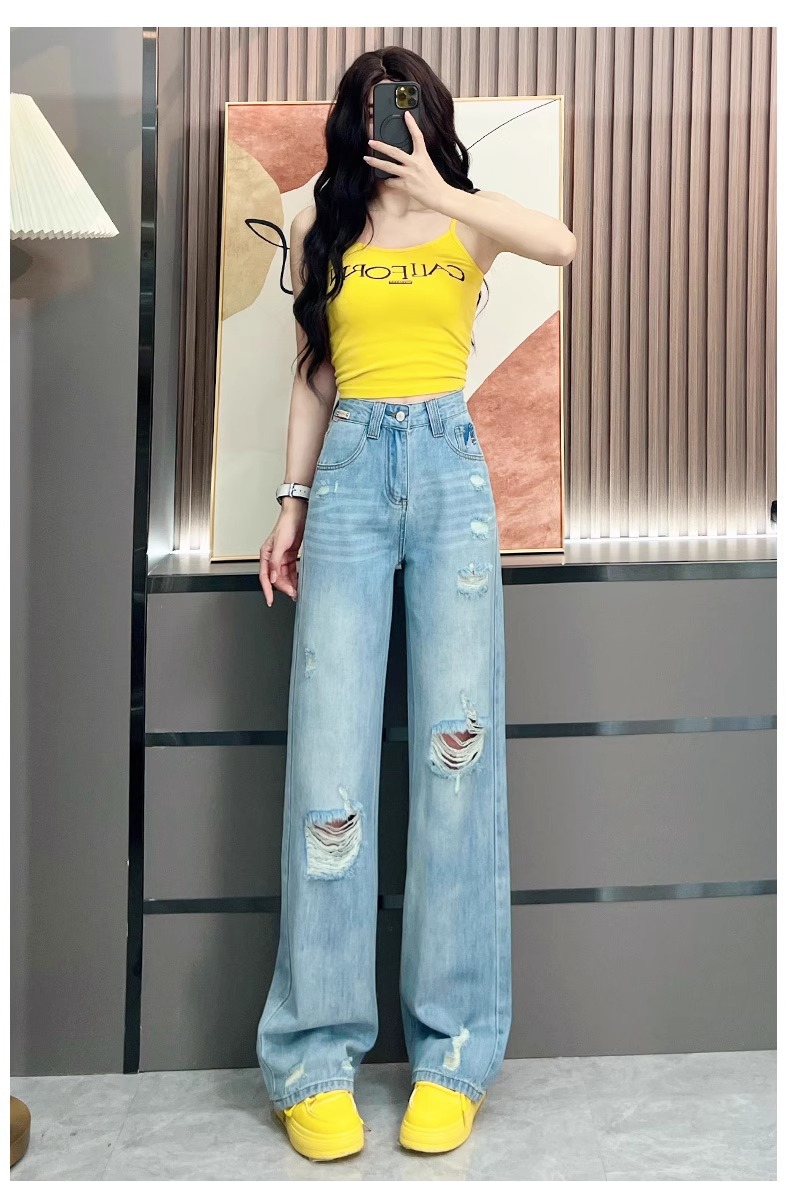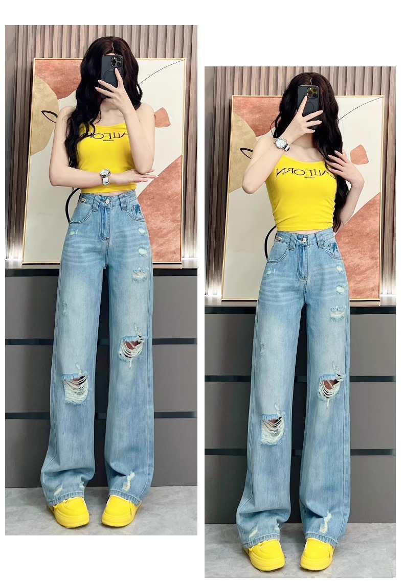 Ou Ruofeng リップドジーンズ女性の 2025 春夏新作薄型年齢軽減ワイドレッグユニークなインターネットセレブストレートパンツ