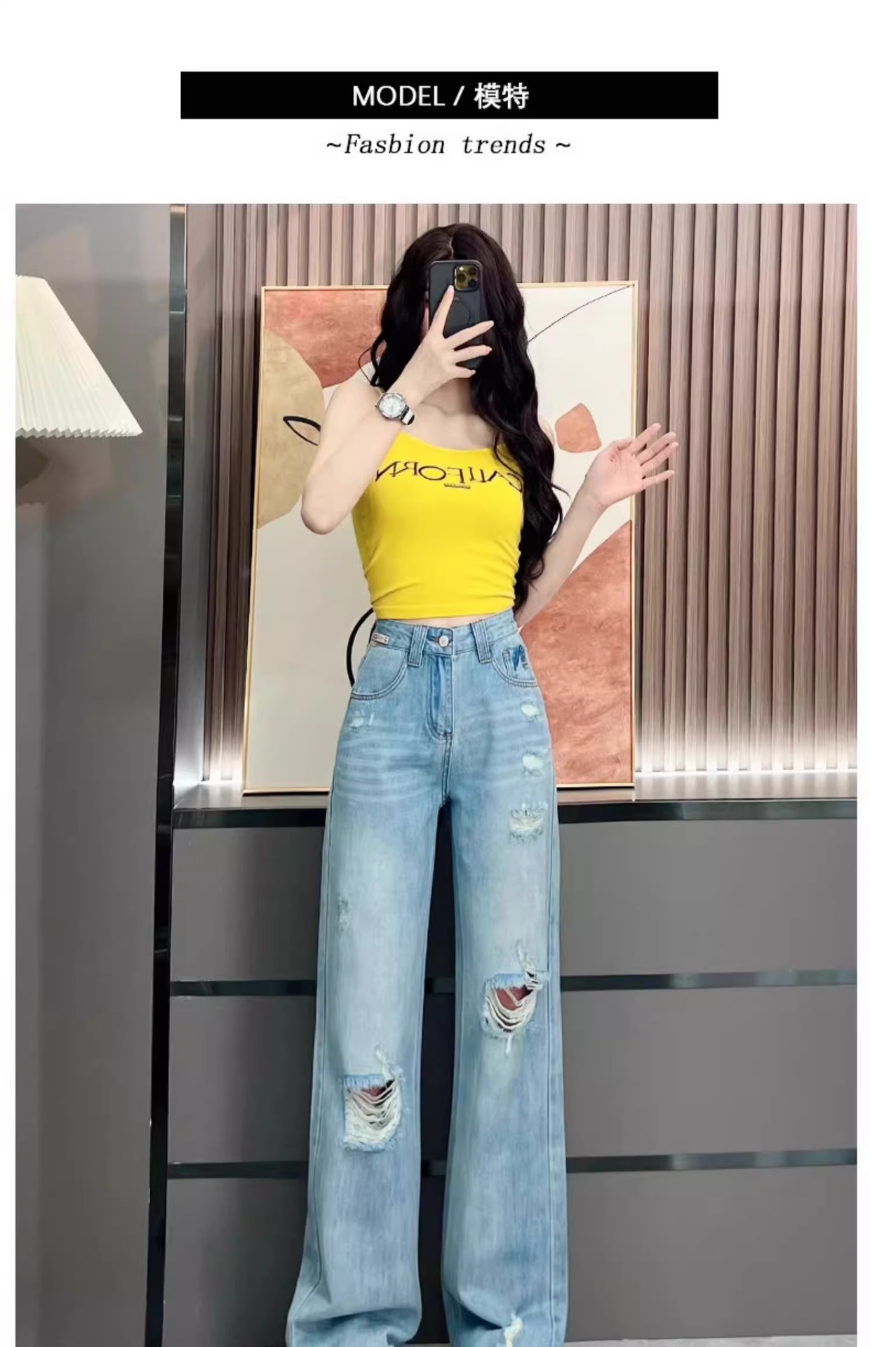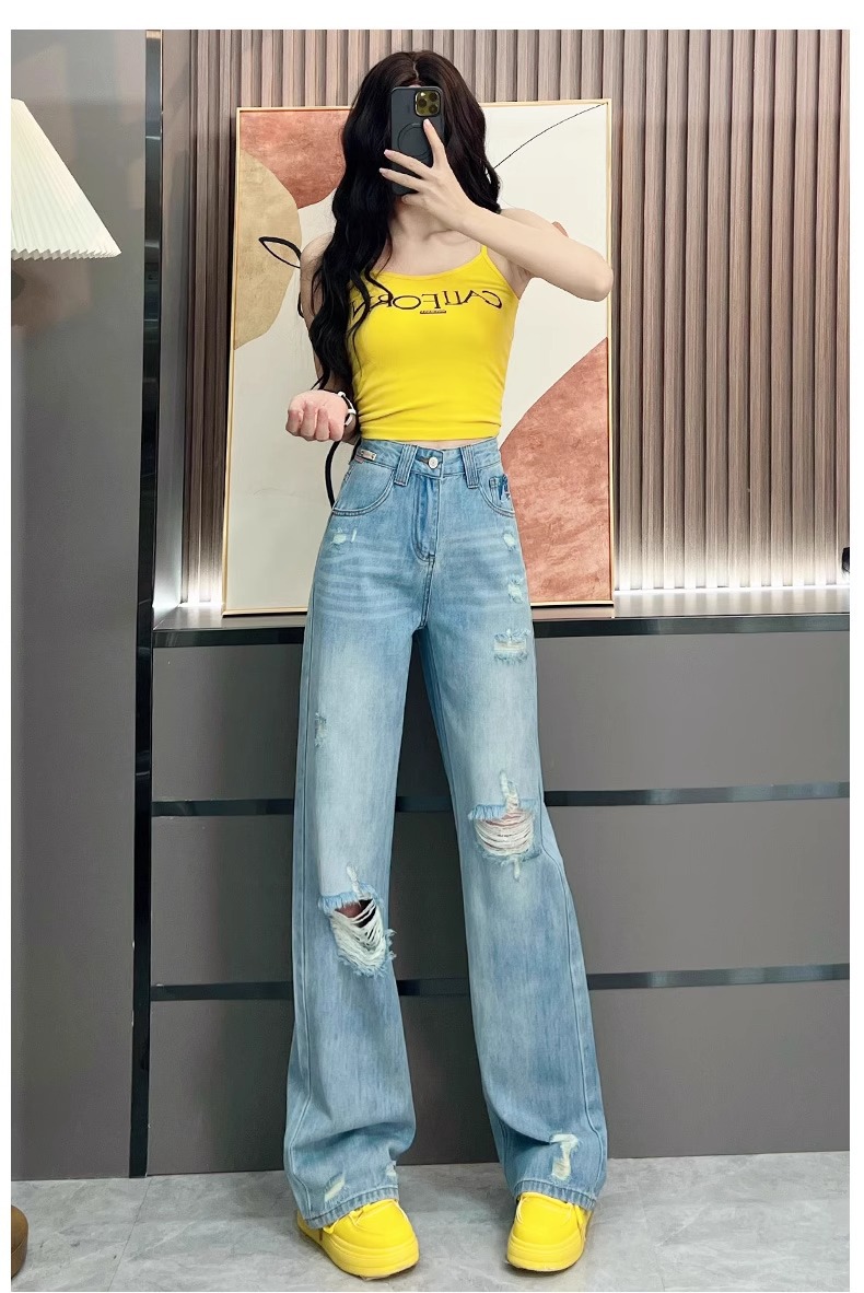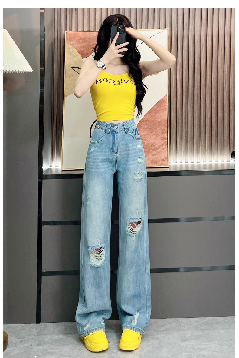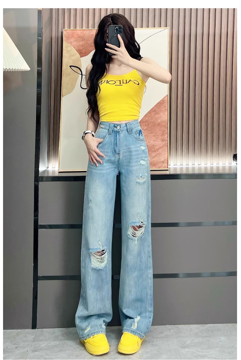 Ou Ruofeng リップドジーンズ女性の 2025 春夏新作薄型年齢軽減ワイドレッグユニークなインターネットセレブストレートパンツ