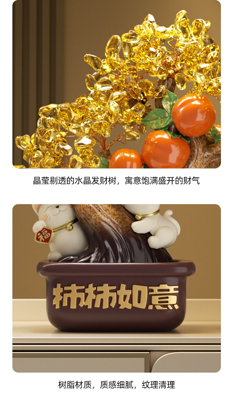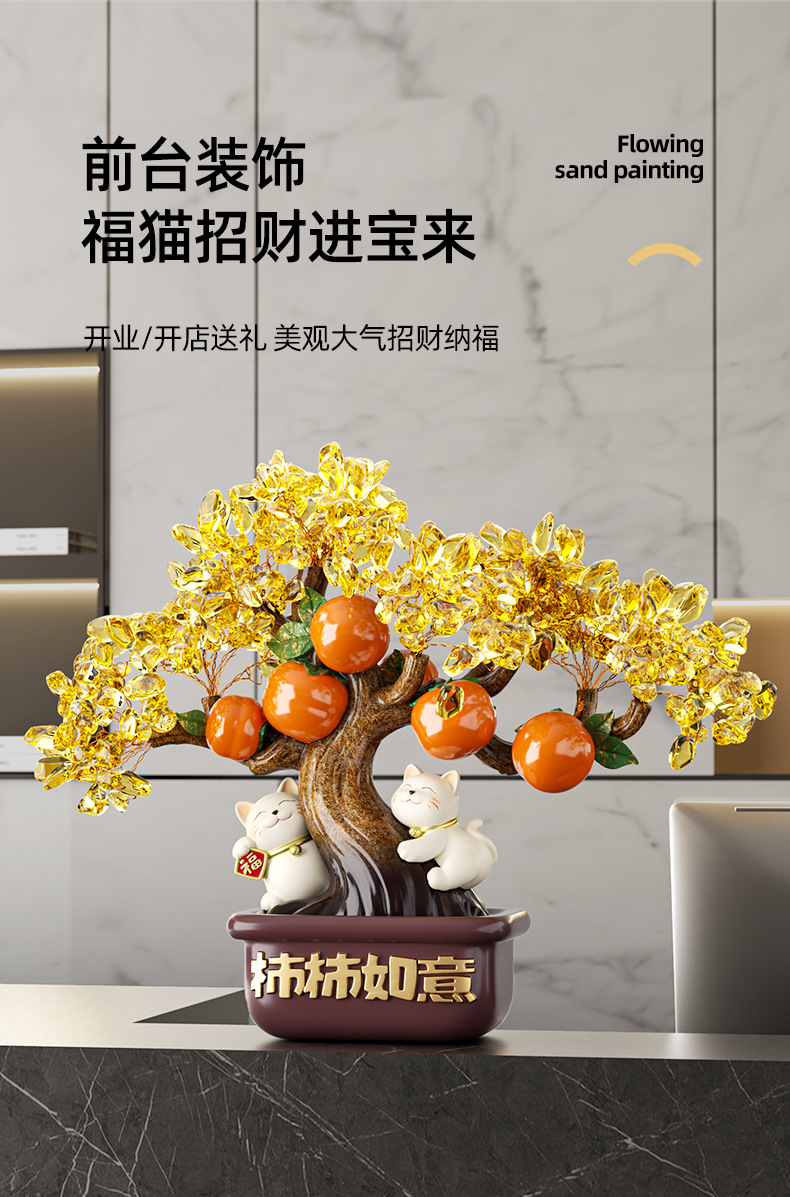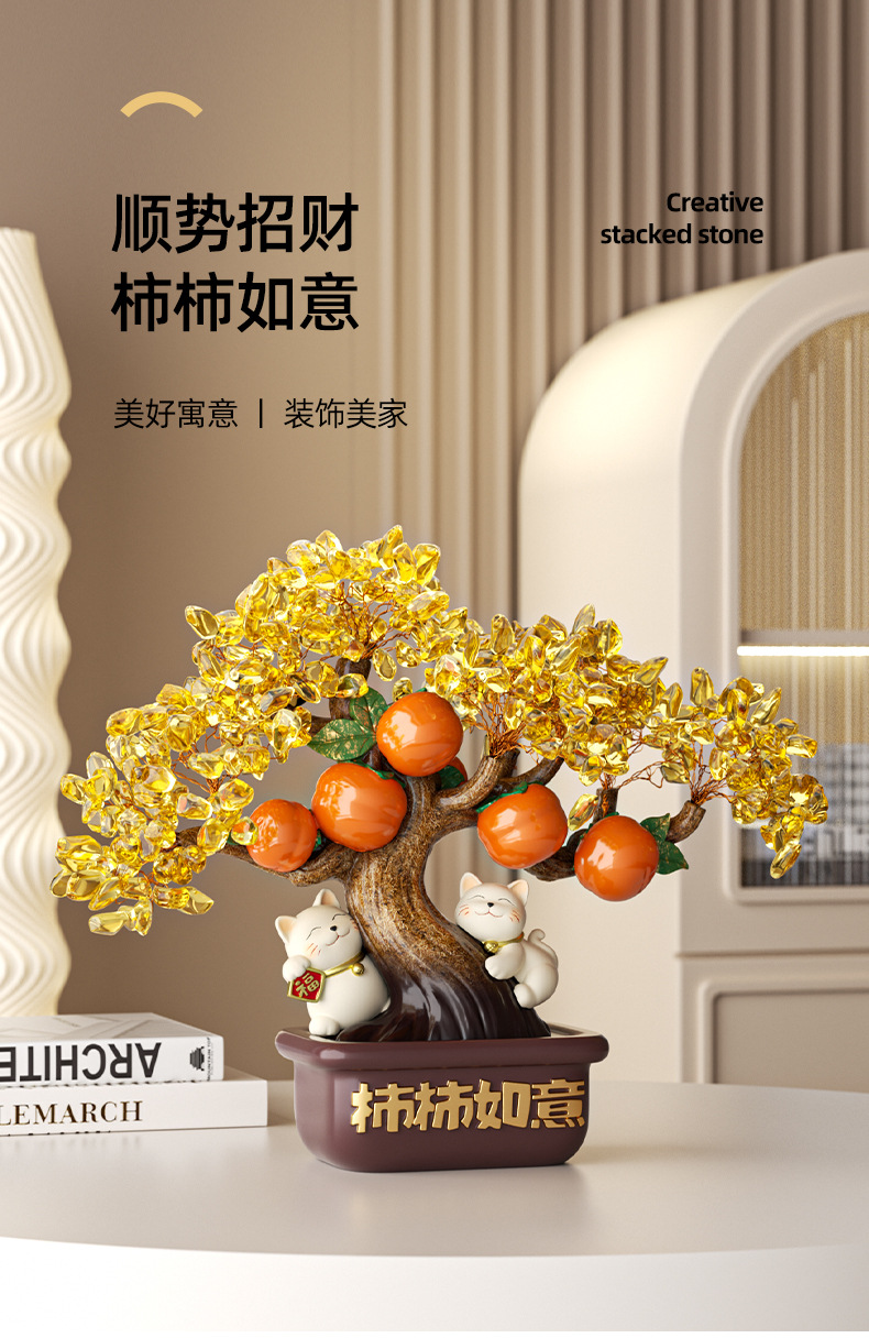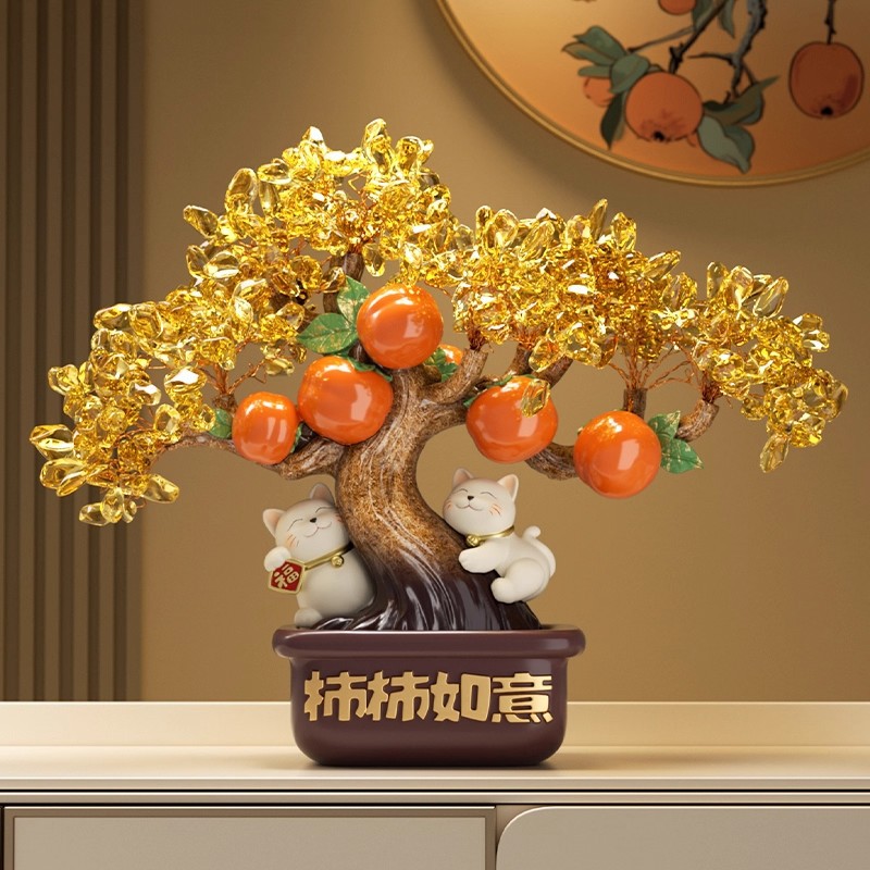 水晶发财树招财猫柿柿如意桌面摆件客厅轻奢高档搬家乔迁新居礼物