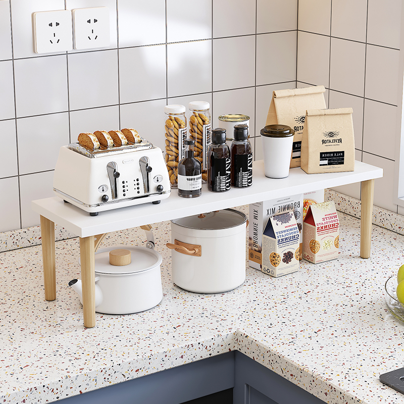 台所のテーブルの上に棚を置いて、棚を分けて収納します。