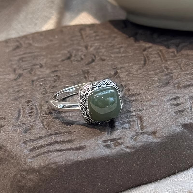 925银复古新中式唐草纹方形戒指环开口调节和田碧玉轻奢简约高级