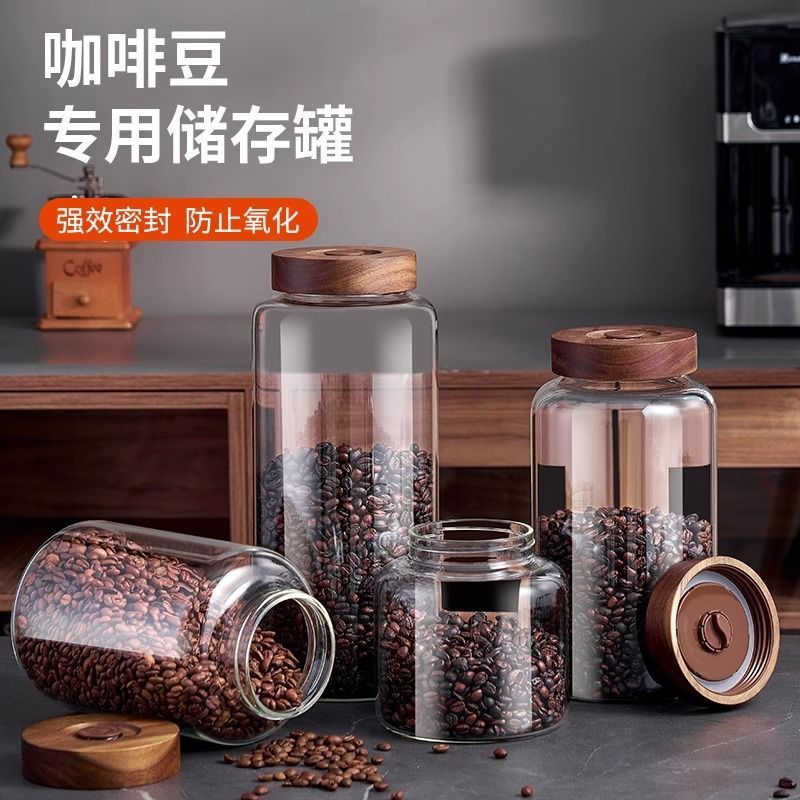 咖啡豆玻璃密封罐单向气阀咖啡粉储存罐木盖陈皮罐木盖玻璃咖啡罐