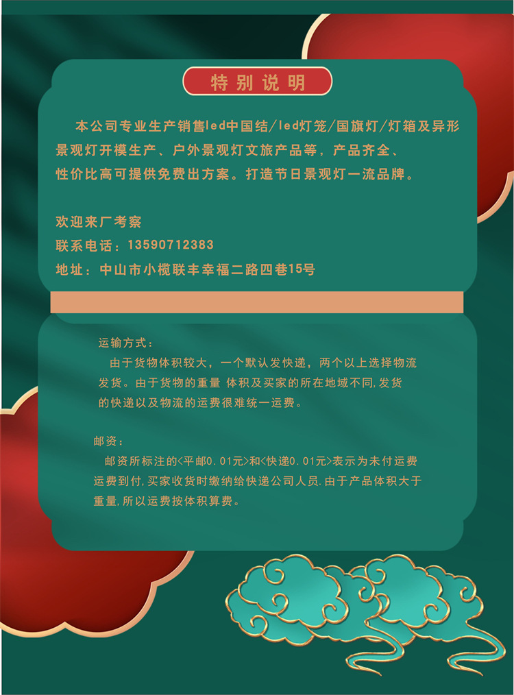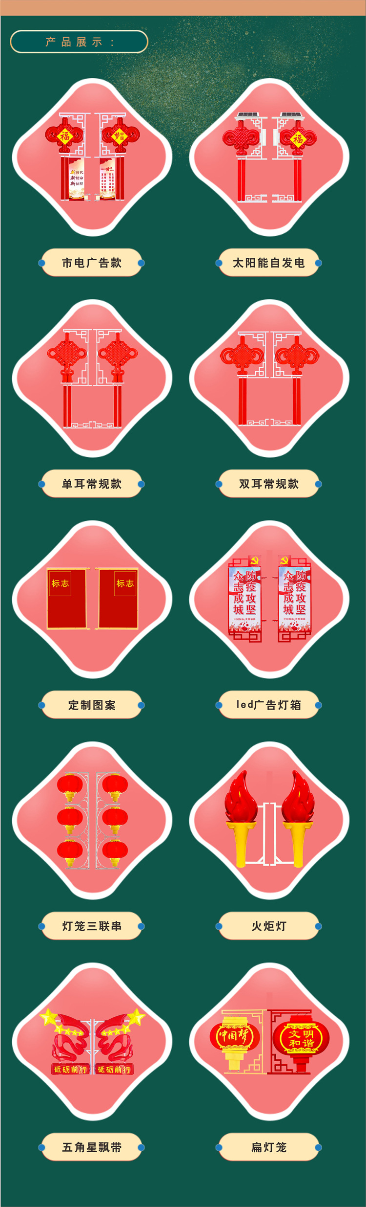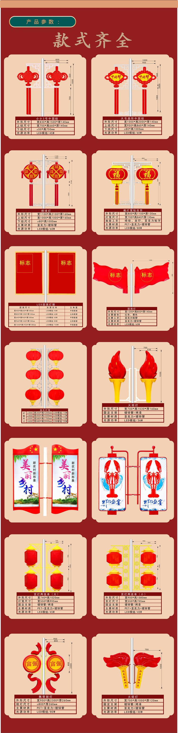 0.6*1.2m チャイニーズノットソーラー,0.6*1.2mチャイニーズドリーム+看板電源,0.75*1.6m従来の主電源,1*2m 中国ノット従来の主電源,0.6*2m ライトボックス主電源,0.4*0.6 フラッグランプ主電源,0.6*1m ファイヤーディスタンスランプ主電源,0.3*1.2m ランタンストリング