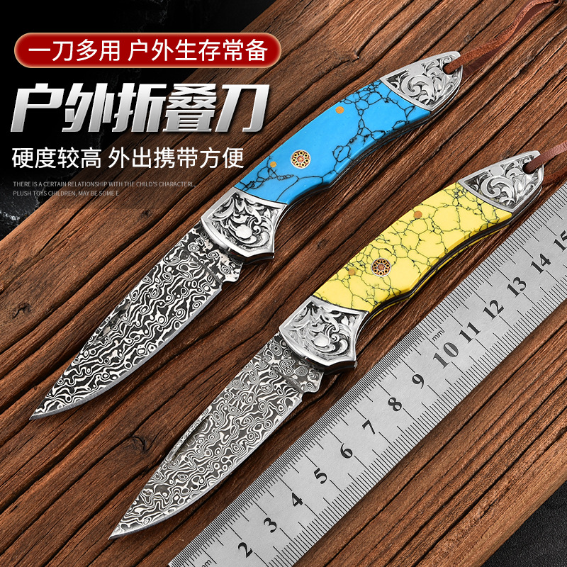 ブルーターコイズ折りたたみナイフ家庭用絶妙なフルーツナイフポータブルキャンプアウトドアナイフダマスカス鋼高硬度本物