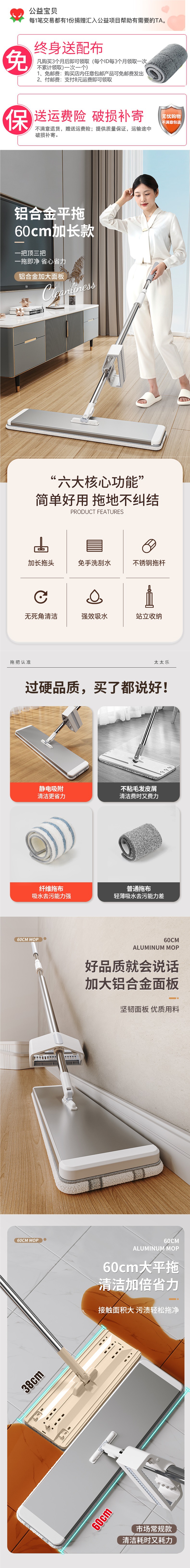 手洗モップを免除して、60cmの大規模なアルミニウム合金家庭用の清潔な大面積の怠け者が2025の新製品を引きずる