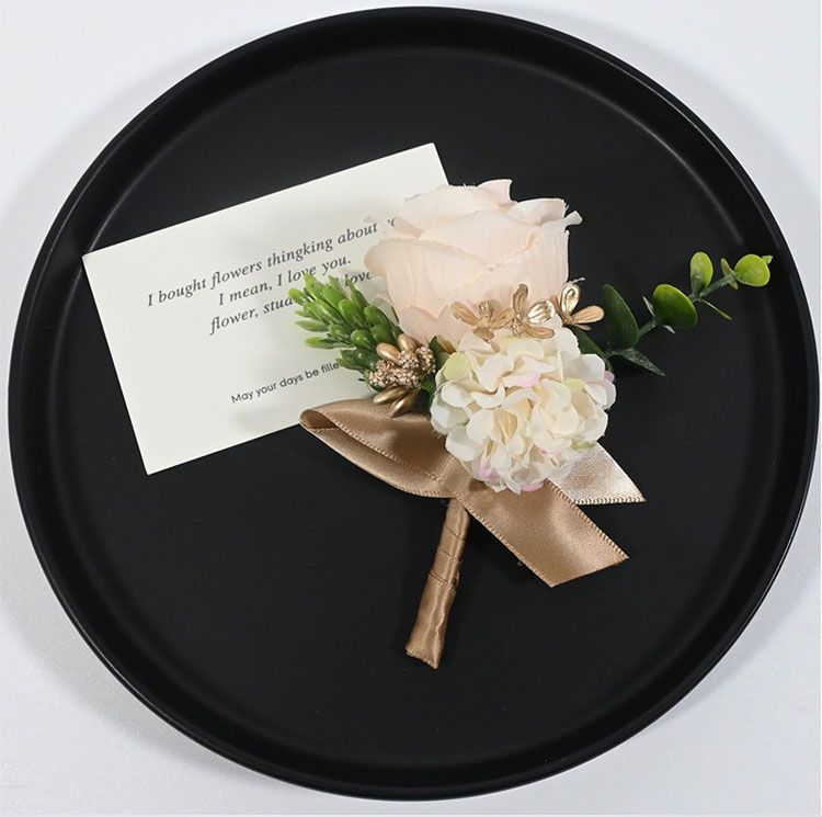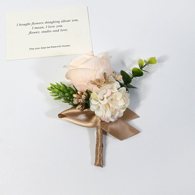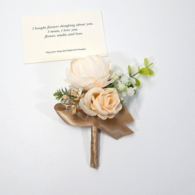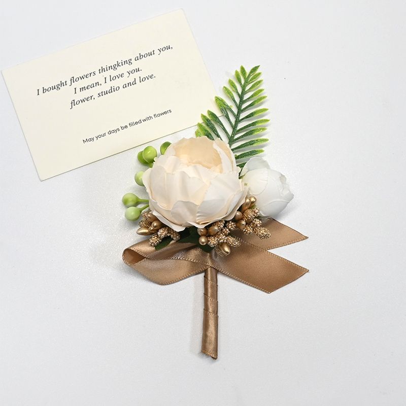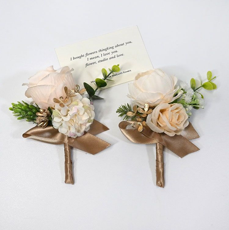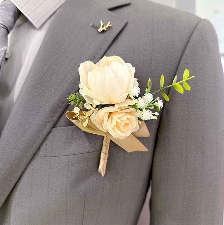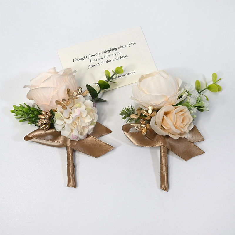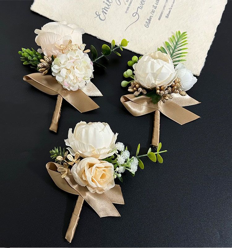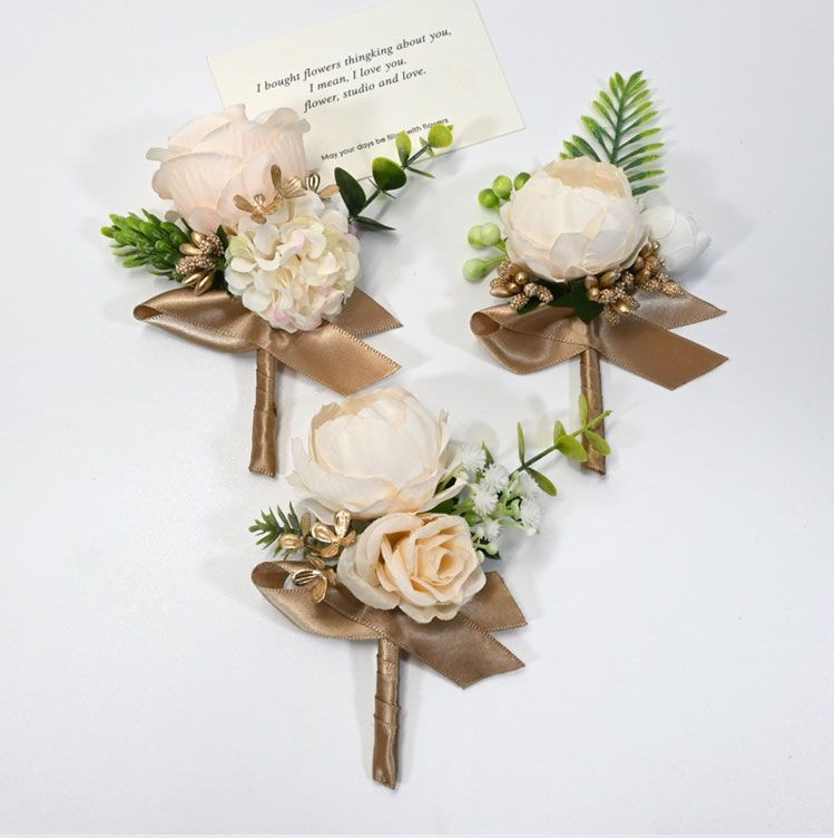 高級コーヒーブートニア、ブライダルブートニア、新郎新婦ブートニア、ブライズメイドシスターズハンドブートニア、ウェディングピオニーオレンジローズ