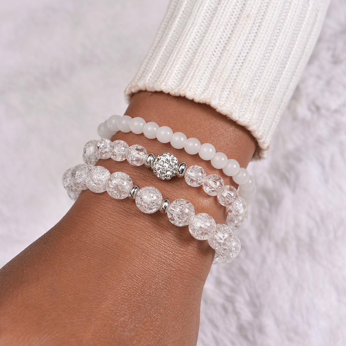 中国風の鉄アクリルダイヤモンド青と白のセラミック模造真珠ビーズ弾性レディースブレスレット 3 点セット