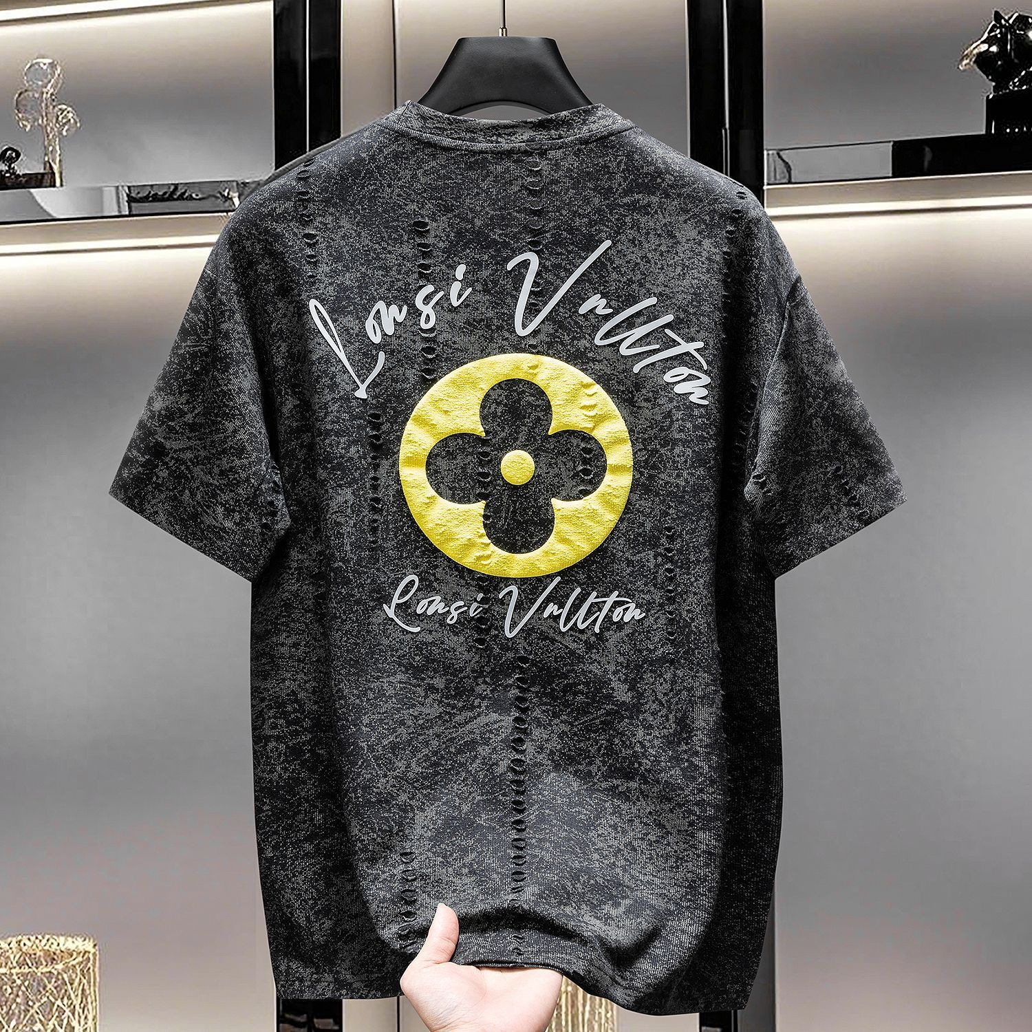 ヨーロッパ駅の高級焼き花丸首半袖tシャツ男性2025新型夏のファッションブランドのゆったりとした豪華な男性半袖