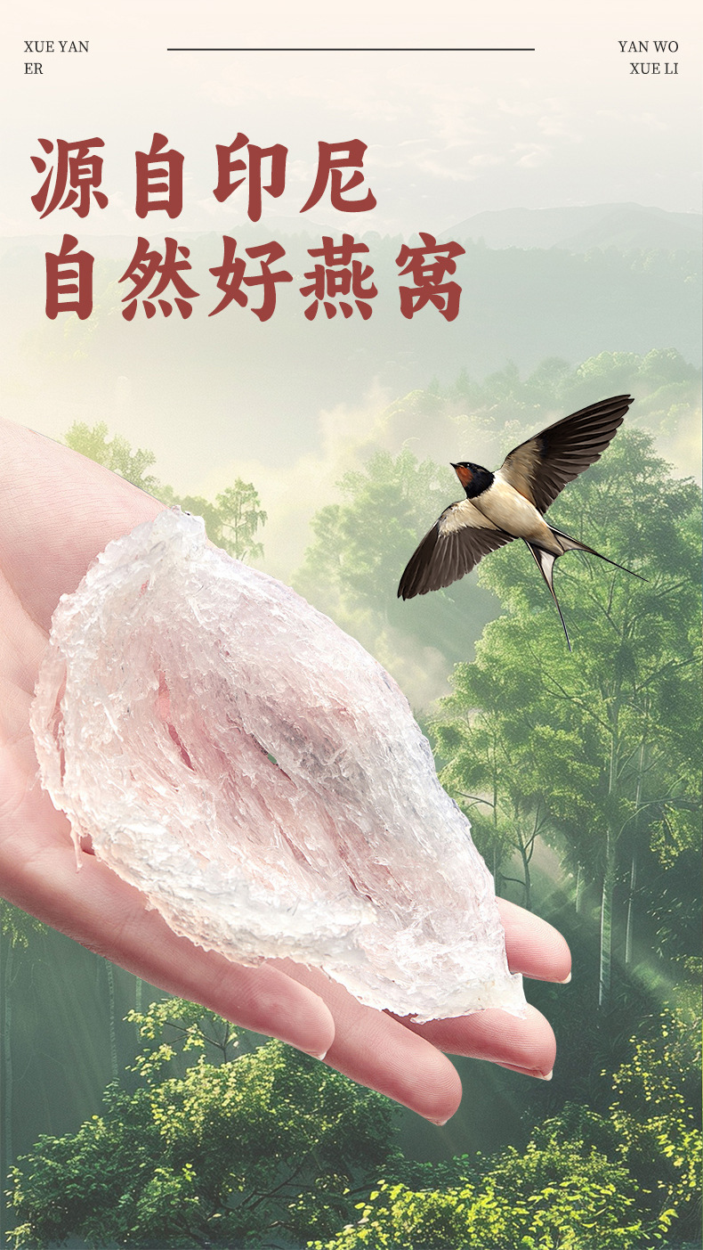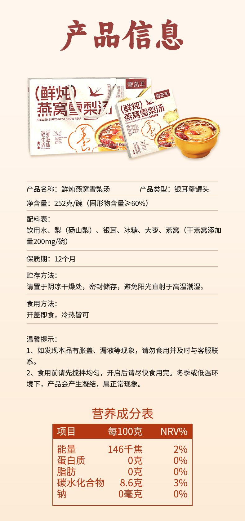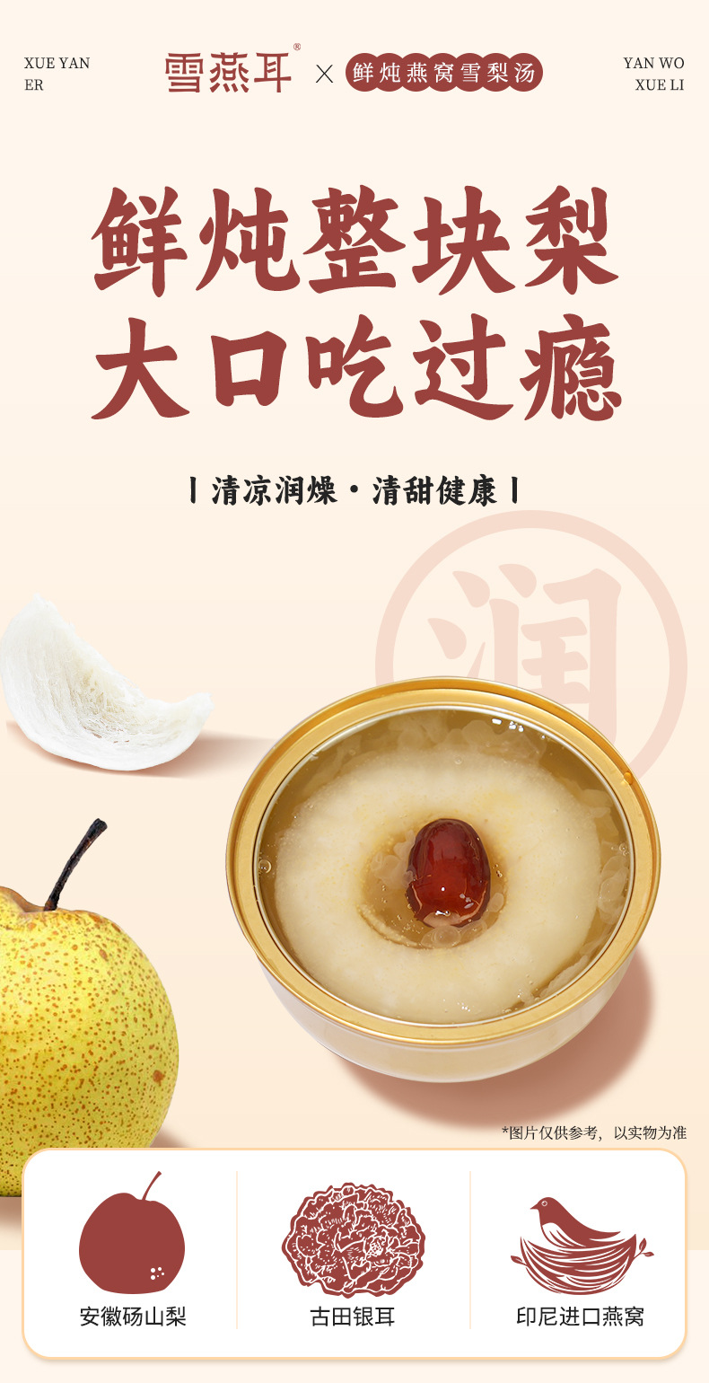原材料と成分 飲料水、梨(唐山梨)、トレメラ菌、氷砂糖、ナツメ、ツバメの巣(乾燥ツバメの巣添加量200mg/杯)