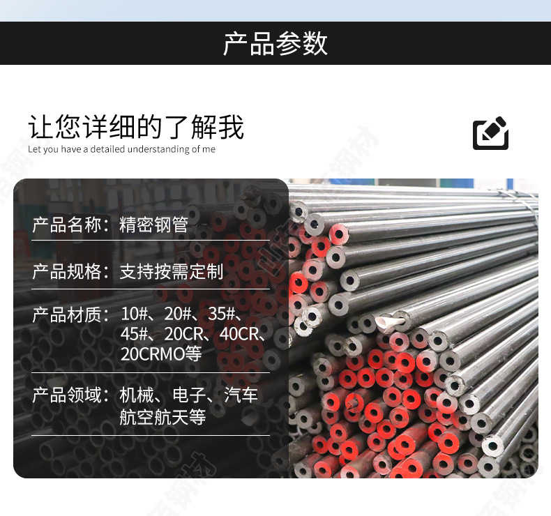 精密钢管、精密机械光亮管、厚壁冷拔精密钢管、精密毛细钢管、热轧精密钢管切割、小口径冷拔钢管、机械零件加工精密管、厚壁空心圆铁管、光亮管切割倒角、冷轧精密管精拉管、精密冷拔毛细钢管、低温合金精密光亮管、小口径铁管