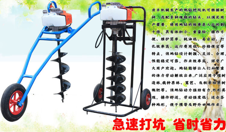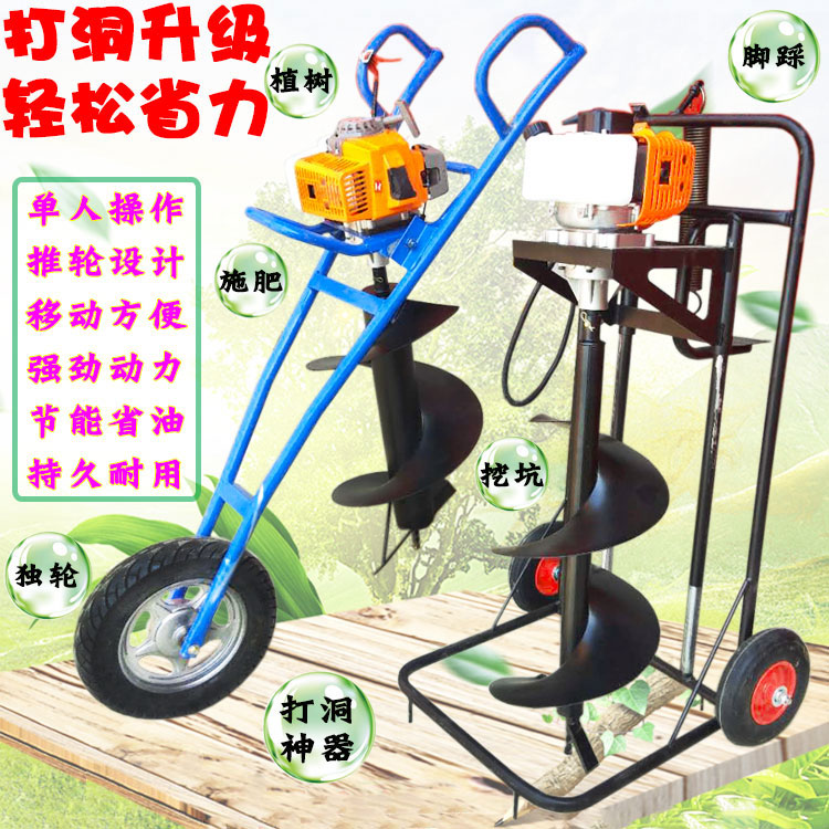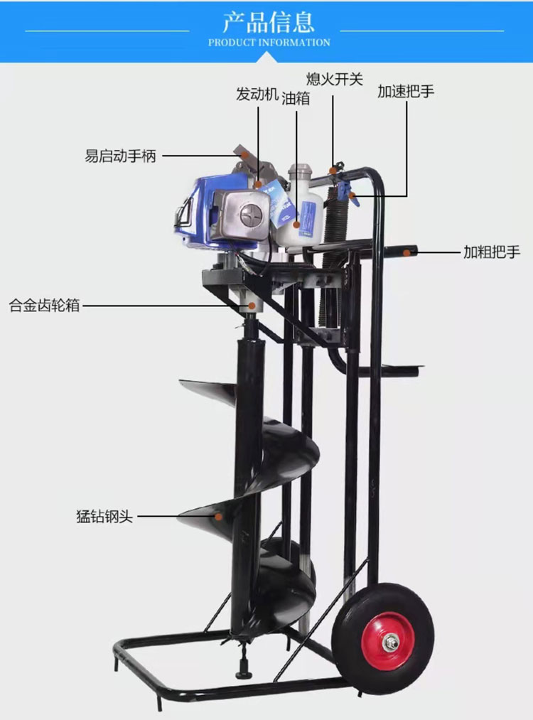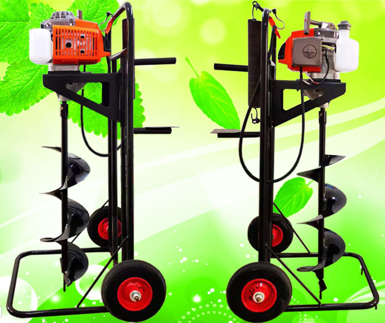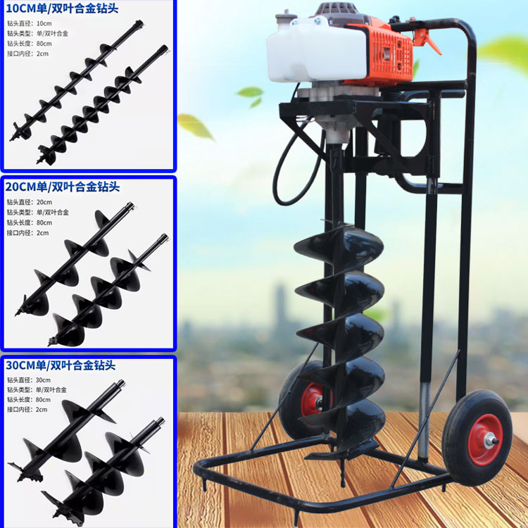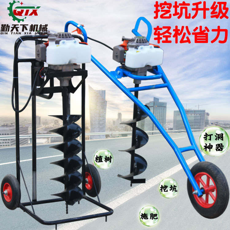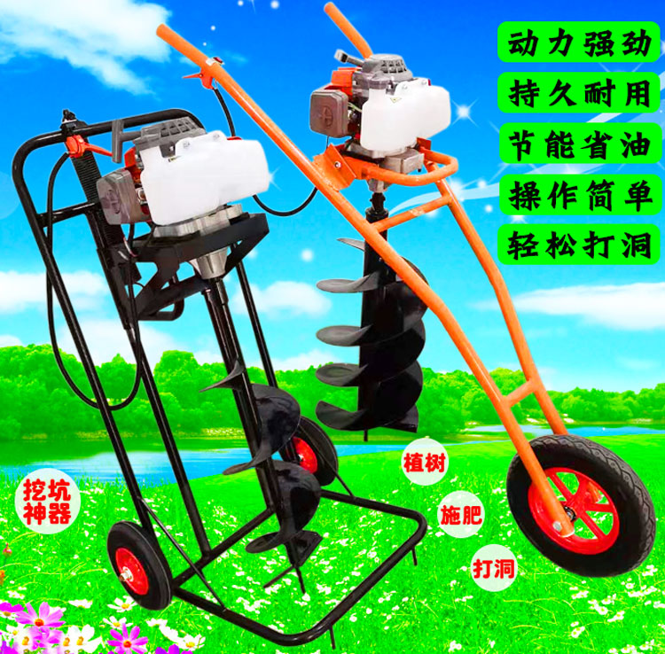 新型带架子植树挖坑机,可配置多种规格的钻头(40-500mm)打出不同大小的孔,用于种植各种根茎的苗木,也可用于木杆,电线杆,水泥杆,大棚杆的载植钻眼,本机钻头采用锰钢合成更加的坚硬。可根据树种,选配多种规格的钻头,以满足用户需要。