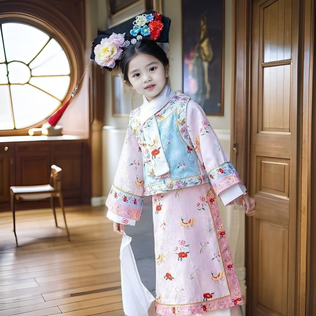 儿童格格服装复原斜襟印花清朝汉服女古装旗袍马面冬季加绒春夏款