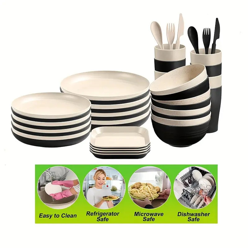 TEMU 人気の小麦わらウォーターカップ、プレート、ボウル、食器セット、家庭用黒プラスチック食器セット、16 点セット