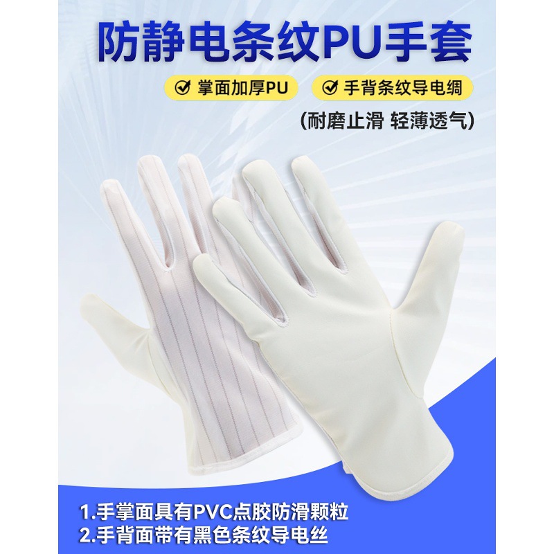 帯電防止PU手袋、硫黄フリー、オフホワイト、イエローPU帯電防止ストライプ手袋、防塵電子工場回路基板工場専用